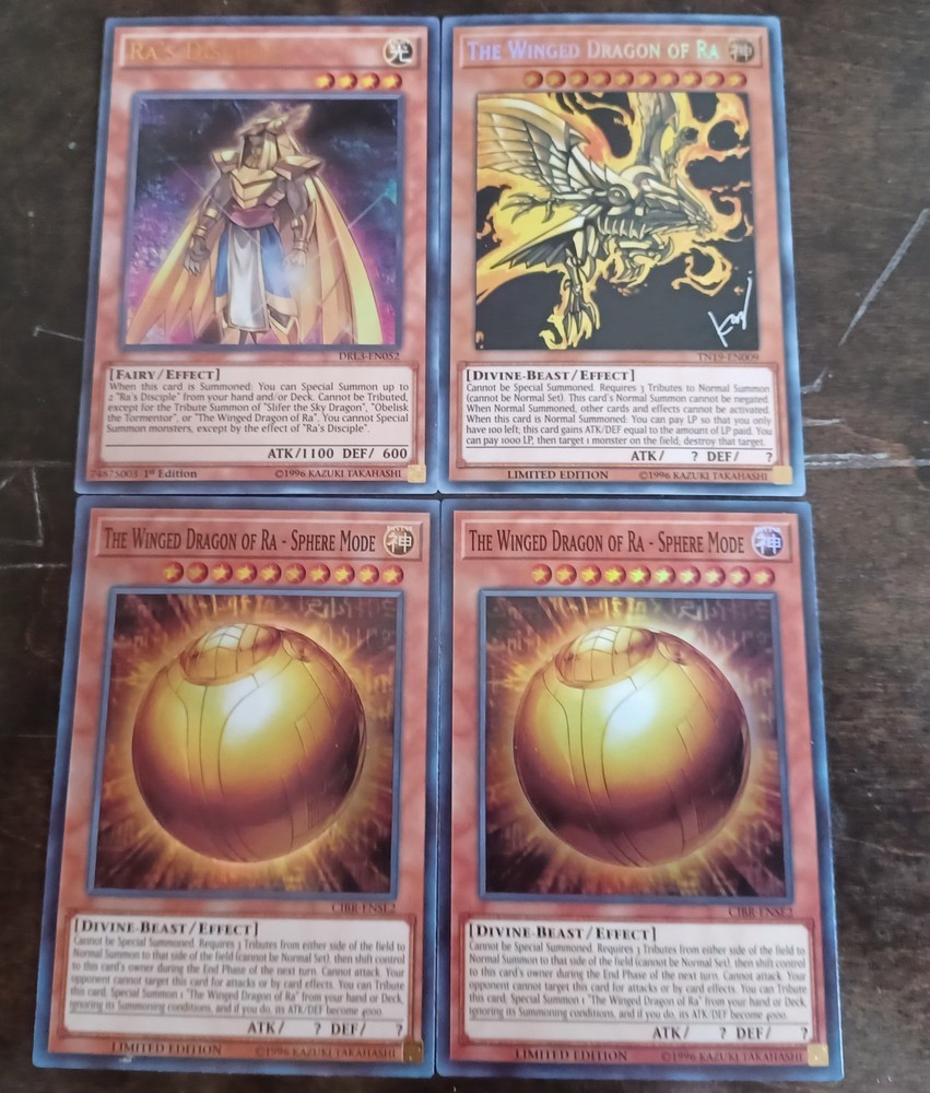 RA'S DISCIPLE (ULTRA RARE), THE WINGED DRAGON OF RA-SPHERE MODE X2 (SUPER RARE), THE WINGED DRAGON OF RA (PRISMATIC SECRET RARE), SLIFER THE SKY DRAGON X4 ( PRISMATIC SECRET RARE), AND OBELISK THE TOR...
