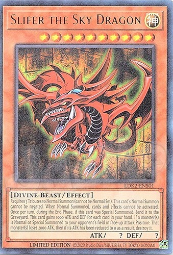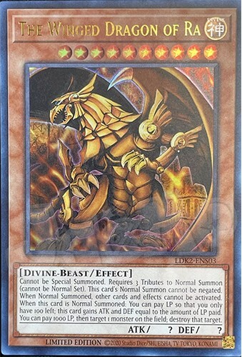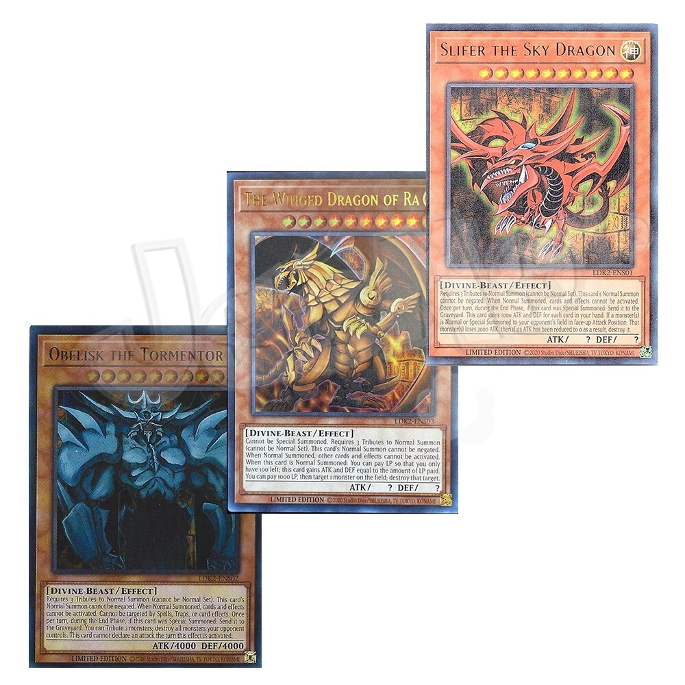 Egyptian God Cards The cards are in NM condition and will be placed in a top sleeve and loader for security. Also will include a free Holographic card which can be Super, Ultra, Secret, etc! Card Information Obelisk the Tormentor - LDK2 - Limited Edition - Ultra Rare Slifer the Sky Dragon - LDK2 - Limited Edition - Ultra Rare The Winged Dragon of Ra - LDK2 - Limited Edition - Ultra Rare