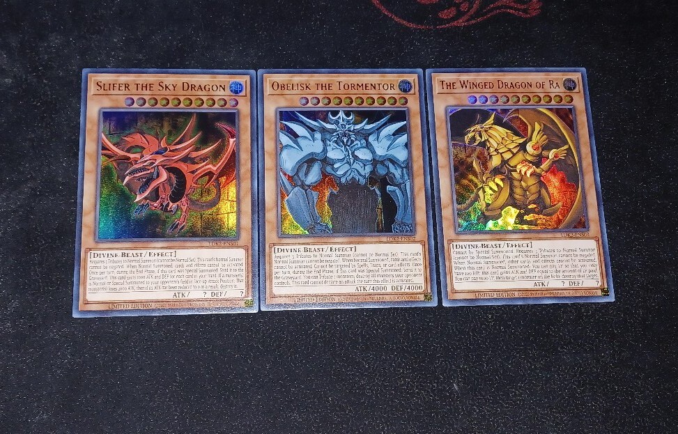 Introducing the legendary Egyptian God Cards from the Yu-Gi-Oh! TCG, including Slifer The Sky Dragon, Obelisk The Tormentor, and The Winged Dragon Of Ra. These cards were featured prominently in the Battle City arc of the anime, and now you have the chance to add them to your collection. These cards are in near mint or better condition, ready to be protected in your own sleeves and binders. Whether you're a seasoned collector or a casual player, these cards are a must-have for any Yu-Gi-Oh! fan. Don't miss your chance to own a piece of the anime's history.