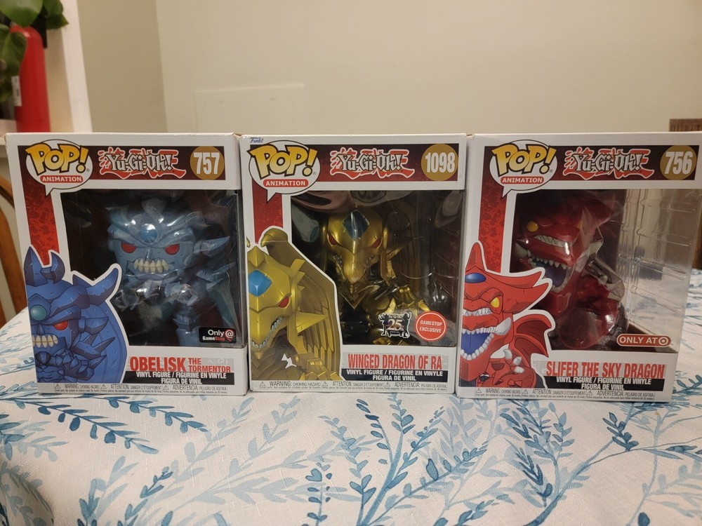 This Yugioh Funko Pop! Egyptian God Lot Of 3 Obelisk Slifer The Sky Wing Dragon Ra is a must-have for any fan of the Yu-Gi-Oh! franchise. The vinyl figures are designed with intricate details and come in their original packaging. The set includes Slifer the Sky Dragon, an iconic character from the anime and manga series. These Funko Pop! figures are a limited edition and were exclusively released at Target. Product features minor wear and tear see pictures for details The product line is Pop and the theme is Anime & Manga. The collection is Funko and the type is Vinyl Figure. The figures are made of high-quality material and are perfect for collectors and fans alike. Add this unique set to your collection today!