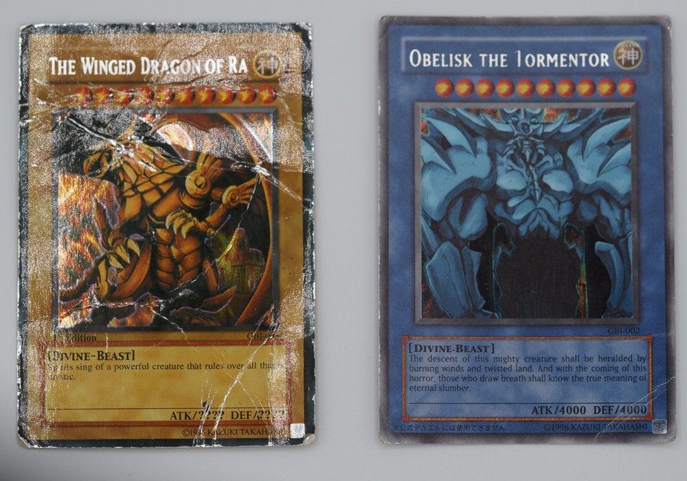 Yugioh GBI-002 Obelisk the Tormentor + The Winged Dragon of Ra GBI-003 Lot DMG . Please be aware these cards are in the condition shown so please refer to the images when purchasing. Both cards show significant use in most areas especially on the edges creases are also present on both cards. The winged dragon of ra is actually a rare 1st edition card and it is real verified by the eye of Anubis on the square foil at the bottom right of the card.