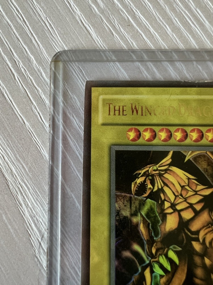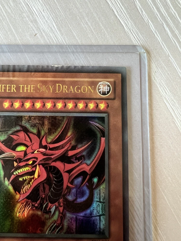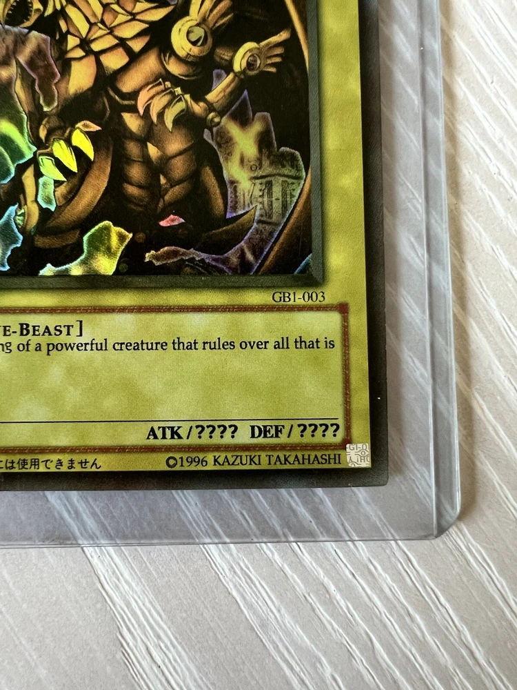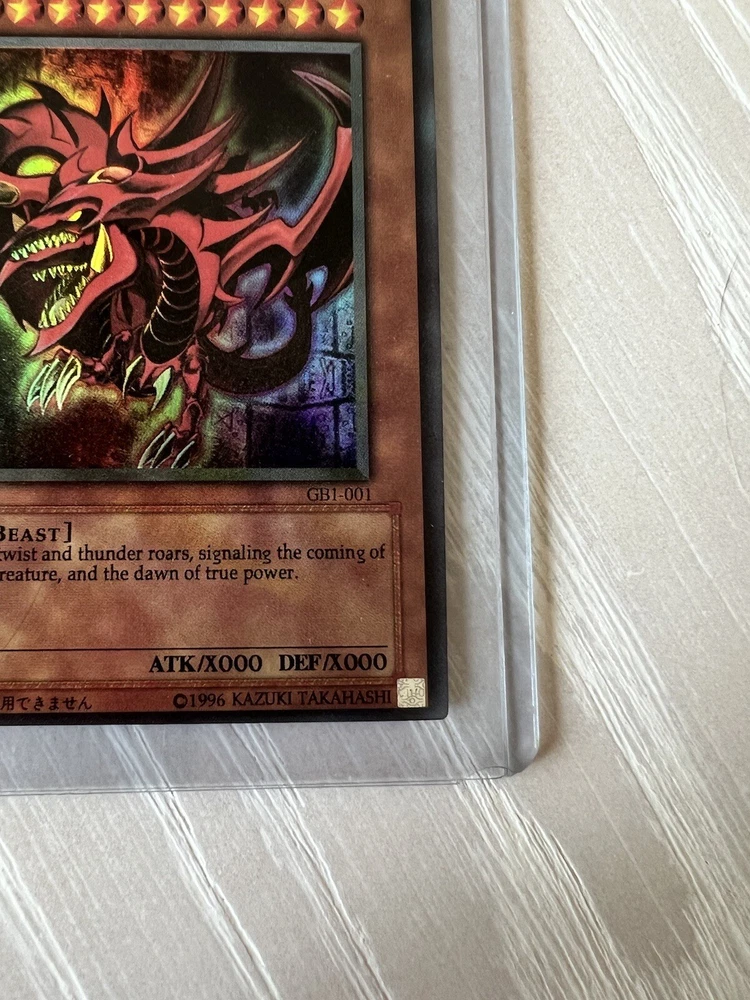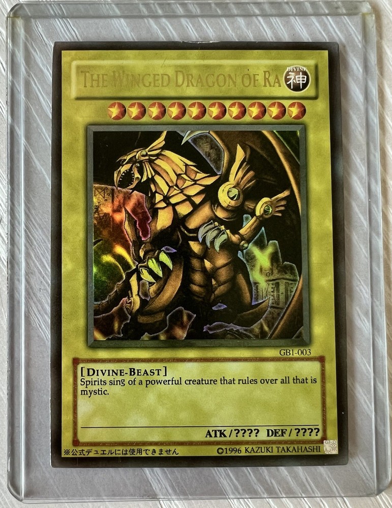 Add the three Egyptian God Cards to your Yu-Gi-Oh! collection from mine. I have had these since I was a kid and have recently pulled them out of the closet. These belong with someone who appreciates and values them more than I do so please, buy them from me! I provided detailed pictures so that you may see the wrinkling of Slifer The Sky Dragon and other small defects. These are ungraded Slifer The Sky Dragon GB1-001, Obelisk The Tormentor GB1-002, The Winged Dragon of Ra GB1-003.