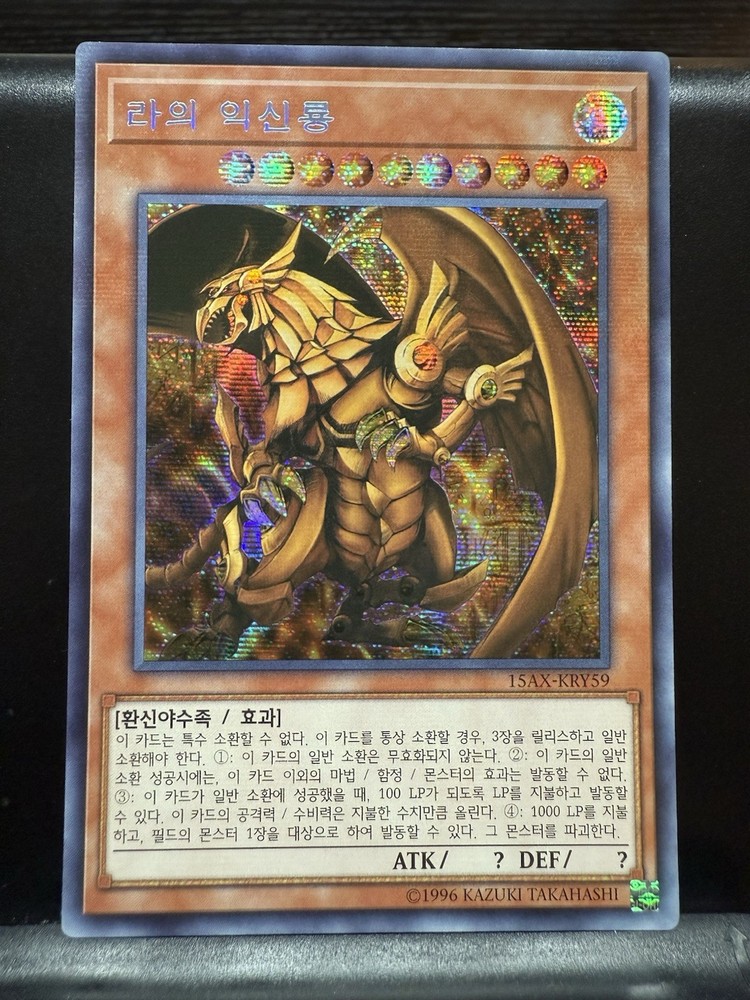 Unleash the power of the legendary Winged Dragon of Ra with this prismatic secret rare card from the Yu-Gi-Oh! TCG. A must-have for collectors and players alike, this card is a standout with its stunning holographic finish. The card is from set 15AX, featuring the divine beast in all its glory, ready to be the centerpiece of your deck or display. Crafted by Konami, this card is produced with high-quality card stock, ensuring durability and a premium feel. Numbered 59, it's designed for the age level of 6 and above. This Korean-language card is not just a valuable piece for gameplay but also an emblem of the Yu-Gi-Oh! legacy, suitable for enthusiasts looking to enhance their collection with a touch of rarity and splendor.