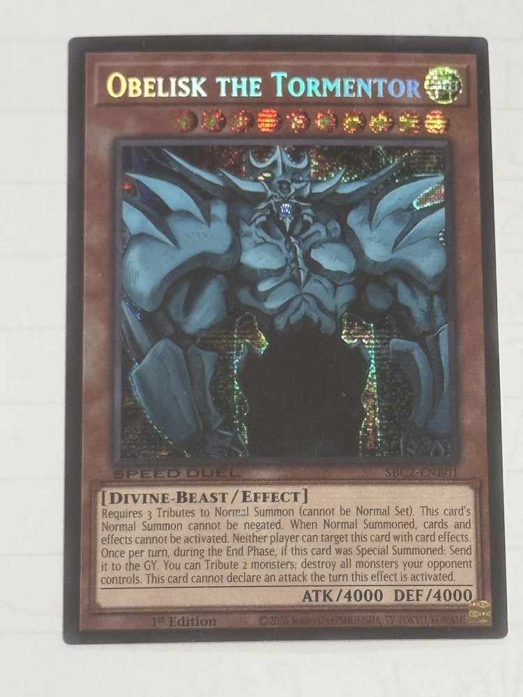 You are bidding on: Yugioh! Obelisk the Tormentor - SBC2-ENB01 - Prismatic Secret Rare - 1st Edition Condition: Condition: Lightly Played | Language: English All photos are stock, unless mentioned otherwise. Card edition, rarity, etc. are listed in the title and description. Cards are in English unless otherwise stated in title or description. Items will be shipped within 1 business day upon receiving cleared payment. We ship Monday through Saturday in order to get the item(s) to you as quickly as possible Before leaving neutral or negative feedback, please contact us beforehand so we can discuss the issue. Feel free to message me with any questions you have regarding this auction or my policies. Shipping Options: USPS Mail - $0.99 Orders $29.99 (exc. sales tax) and under will be sent in a white envelope in a card saver + soft sleeve using eBay's Standard Envelope tracking service. Orders $30.00 (exc. sales tax) and over will be sent with free USPS tracking information w/ toploader + soft sleeve. Priority Mail - $9.99 2-3 Day shipping Orders will be shipped in a flat rate envelope in a toploader + soft sleeve. Priority Express Mail - $29.99 1-2 Day shipping Orders will be shipped in a flate rate envelope in a toploader + soft sleeve. *All orders over $100 will be sent with free insurance. All orders over $250 will be sent with free insurance and signature confirmation.* Card Grading: Near Mint (NM) - Cards with this grade will show minimal to no wear from shuffling, play or handling and can have a nearly unmarked surface, crisp corners and unblemished edges outside of a few minimal flaws. Holographic cards are more scrutinized than non-holo cards. Lightly Played (LP) - Cards with this grade may have a few dings, light playwear and/or edgewear. A few surface scratches are acceptable. A crease or bend is acceptable if it is less than approximately 1/2 inch in size and is only visible on one side. Moderately Played (MP) - Cards with this grade may have dings, playwear and/or edgwear, 1 or 2 creases or bends that do not go through the length of the card. Cards may have a 1 or 2 deep scratches. Heavily Played (HP) - Cards with this grade may have dings, playwear and/or edgwear, creases or bends that may go the length of the card, markings and/or coloring, tears on the edges. Despite being the lowest of grading, these cards are still tournament legal. If you receive a card not in the stated condition, please contact us to return the item for a full refund. Thank you for buying.