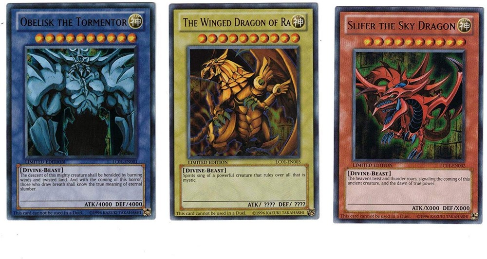 Yugioh Legendary Collection Sealed Promo Packs. One of each of the most powerful monsters ever created: Slifer the Sky Dragon, Obelisk the Tormentor, Winged Dragon of Ra, Blue Eyes White Dragon, Dark Magician, and Red Eyes Black Dragon! Condition is New. Shipped with USPS First Class Package.