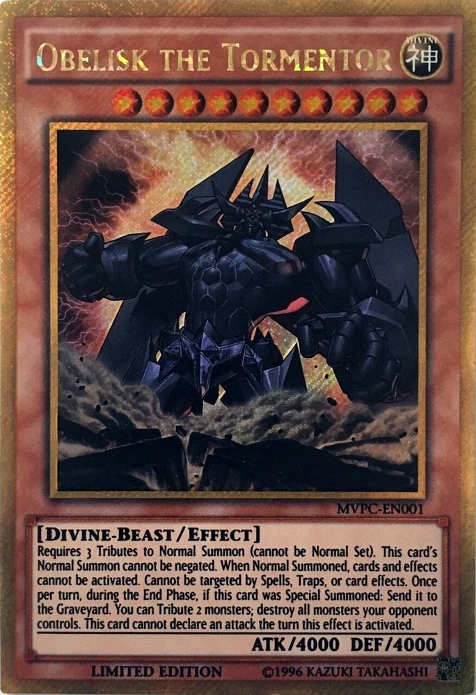 You are bidding on: Yugioh! Obelisk The Tormentor - MVPC-EN001 - Gold Secret Rare - Dark Side Of Dimensions Movie Promo Condition: Condition: Moderately Played | Language: English All photos are stock, unless mentioned otherwise. Card edition, rarity, etc. are listed in the title and description. Cards are in English unless otherwise stated in title or description. Items will be shipped within 1 business day upon receiving cleared payment. We ship Monday through Saturday in order to get the item(s) to you as quickly as possible Before leaving neutral or negative feedback, please contact us beforehand so we can discuss the issue. Feel free to message me with any questions you have regarding this auction or my policies. Shipping Options: USPS Mail - $0.99 Orders $29.99 (exc. sales tax) and under will be sent in a white envelope in a card saver + soft sleeve using eBay's Standard Envelope tracking service. Orders $30.00 (exc. sales tax) and over will be sent with free USPS tracking information w/ toploader + soft sleeve. Priority Mail - $9.99 2-3 Day shipping Orders will be shipped in a flat rate envelope in a toploader + soft sleeve. Priority Express Mail - $29.99 1-2 Day shipping Orders will be shipped in a flate rate envelope in a toploader + soft sleeve. *All orders over $100 will be sent with free insurance. All orders over $250 will be sent with free insurance and signature confirmation.* Card Grading: Near Mint (NM) - Cards with this grade will show minimal to no wear from shuffling, play or handling and can have a nearly unmarked surface, crisp corners and unblemished edges outside of a few minimal flaws. Holographic cards are more scrutinized than non-holo cards. Lightly Played (LP) - Cards with this grade may have a few dings, light playwear and/or edgewear. A crease or bend is acceptable if it is less than approximately 1/2 inch in size and is only visible on one side. Moderately Played (MP) - Cards with this grade may have dings, playwear and/or edgwear, 1 or 2 creases or bends that do not go through the length of the card. Heavily Played (HP) - Cards with this grade may have dings, playwear and/or edgwear, creases or bends that may go the length of the card, markings and/or coloring, tears on the edges. Despite being the lowest of grading, these cards are still tournament legal. If you receive a card not in the stated condition, please contact us to return the item for a full refund. Thank you for buying.