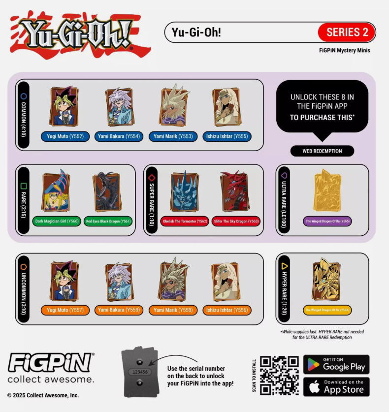 This listing is for the 1 pin pictured. This is a brand new, locked (Code has NOT been redeemed in the app) official Konami/Yu-Gi-Oh! FigPin mini. This comes from the Yugioh Mystery Series 2 FigPin Minis boxes. This pin is the "Super Rare" rarity. The pull rates are shown in the 2nd photo of this listing.