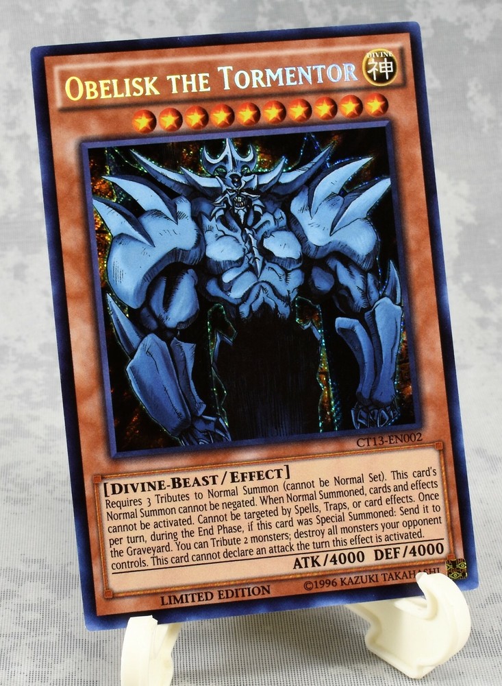 Yugioh Obelisk The Tormentor CT13-EN002 Secret Rare Limited Edition Yu-Go-Oh! DESCRIPTION: Yugioh Obelisk The Tormentor CT13-EN002 Secret Rare Limited Edition Yu-Go-Oh! NO RETURNS. Most demanding card. Free Combined shipping on cards. Gem Mint Condition . True Collectors Card. See All photos. 100% AUTHENTIC OFFICIAL KONAMI CARDS I don't have any idea on Trading card collection. Taking help from my son & internet to give best description possible. So if you find any mistake in detail, please excuse me. PHOTOS ARE PART OF ITEM DESCRIPTION ? Please do not assume anything. What you see in the photos with regard to this item is what you will receive. Please use your own judgment when determining condition, quality, style, age, and overall appearance. Please contact me prior to purchasing if any lingering questions, concerns, or need for additional information. Photos/Questions: Please view the photos for details as to design and condition. Additional photos are always available for the asking. I would recommend to check pictures with Ebay Zoom/Enlargement enhancement function so that you can clearly see what you will receive and decide on quality and condition. Buyer will receive the item(s) shown in the photos. Please do not assume anything ? if it is not in the pictures or not described in the listing. Ebay will issue buyer an invoice at time of purchase. Please contact me before purchasing if you have any questions or concerns. COLOR VARIANCE: Color tone can be affected by your screen monitor. Hue and depth of color is also affected by lighting sources (sunlight (v) room lighting (v) digital camera flash). Anything that is beyond normal wear and use we will specifically describe for you in the listing. PHOTO GALLERY: (Photos are taken with and without (normal room lighting) digital flash.?.color hue and tone (glisten, sparkle, clarity, etc) will always be affected by light source (sunlight ? room lighting ? direct glare or spotlight, etc.). Payment Policy: PayPal is the only payment method available. Credit cards accepted via PAYPAL only. Shipping & Handling: Item will be shipped via USPS Mail Service to anywhere USA. We do not ship to P.O. Box addresses ? need to have an actual street address without prior approval. USPS service selected is at seller discretion, e.g. USPS Priority Mail, USPS First Class Mail, or Parcel Post. Seller may opt to use less expensive USPS shipping service when available ? USPS requires Priority Mail to many regions, and restricts the use of Parcel Post. Likewise, upgrading service or adding signature confirmation/insurance is at seller discretion. Buyer pays for all shipping and handling costs - ebay calculator quoted shipping costs includes insurance, tracking, shipping service, signature confirmation (if needed) and sellers out of pocket costs for packaging material, packing, and handling. We use extreme care and extra packaging materials to avoid damage or breakage during USPS transportation and delivery ?our packages may take a bit longer to unpack, but better than to receive a one-of-a- kind damaged item. We do not make a profit from Shipping and Handling. If there is an overpayment, seller will refund overpayment after we have been reimbursed for all out of pocket expenses. Please contact me if any questions regarding S&H. Local Buyers: If you live locally near my area, you are welcome to pick up the item in person and save on Shipping and handling charges fees ? please contact me for pickup arrangements. International Shipping: International shipping with eBay GSP only. Loss/Damage: Loss/Damage during transit is covered by USPS insurance. If in the unlikely event that your item arrives damaged during USPS shipping, please DO NOT FILE AN EBAY CLAIM ? please contact Seller for assistance in filing your insurance claim - retain all packing materials, packing labels, and the damaged item. Your claim needs to be filed with your local USPS post office in order to obtain a registered USPS claim number. Please be prepared to show damaged item and/or provide photos of damage if requested. Please un-package and handle the purchased antique / collectible item with care to avoid possible post delivery unintended damage. Return Policy : Item(s) sold as is ? as described and photographed. Please be sure to read all listing information and view all photos before purchasing (BIN) . If, in the rare circumstance, the item you purchased is clearly and obviously not the item we described and photographed, please contact us as soon as possible via the Ebay Email messaging system. PLEASE READ ALL DESCRIPTION INFORMATION, ASK ALL QUESTIONS, AND LOOK WELL AT PHOTOS BEFORE BUYING. We are here to make sure that every customer is satisfied with their purchase! If you have any problems with any item, or you feel that you cannot leave 5-star feedback in every category, please contact us as soon as possible and give us a chance to resolve the issue. Feedback will be left for the buyer after feedback has been left for us here?feedback is confirmation to us that you received the item as expected. We try to accurately and completely describe the item, and aim to include any and all condition issues. We do not omit condition issues by intent or design. We mainly sell used/vintage/antique items, and some wear is to be expected. Our goal is that anything more than appropriate or expected normal wear is always documented in the listing and pictures. All items are kept in a smoke-free and pet free environment, but may have been exposed to smoke or pet at some point in their existence. THANK YOU FOR VISITING MY EBAY STORE! WE LOOK FORWARD TO DOING BUSINESS WITH YOU!