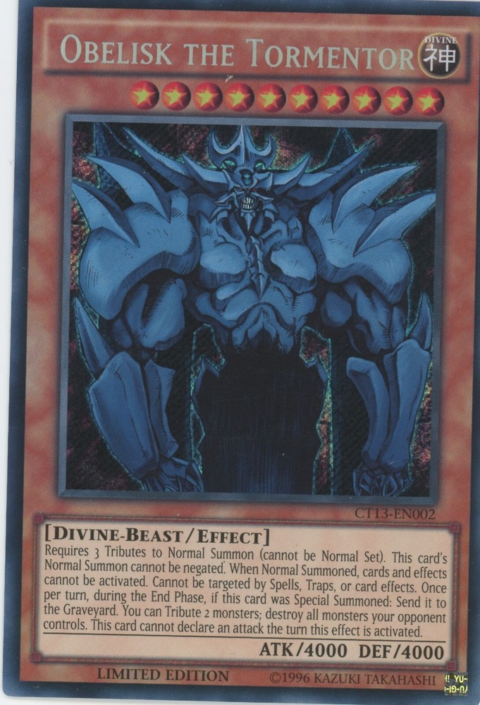 Yugioh Obelisk The Tormentor CT13-EN002 Secret Rare NM You can find more Yu-Gi-Oh cards of all value and rarity in our other listings All cards are in excellent condition unless stated otherwise and the photos are of cards we own but may not be the exact card you receive due to the quantities listed.