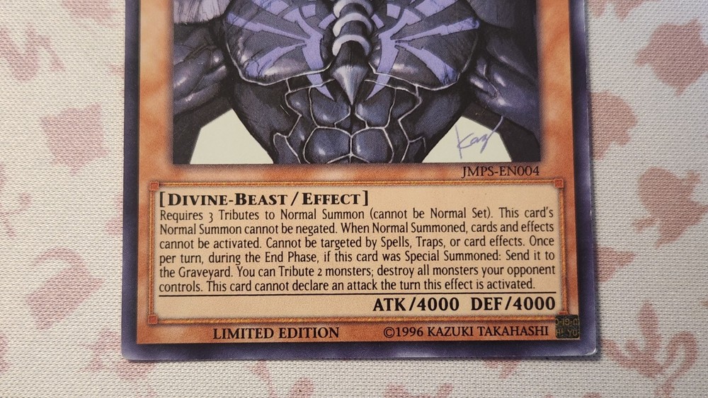 | Card Text | Requires 3 Tributes to Normal Summon (cannot be Normal Set). This card's Normal Summon cannot be negated. When Normal Summoned, cards and effects cannot be activated. Cannot be targeted by Spells, Traps, or card effects. Once per turn, during the End Phase, if this card was Special Summoned: Send it to the Graveyard. You can Tribute 2 monsters; destroy all monsters your opponent controls. This card cannot declare an attack the turn this effect is activated. |