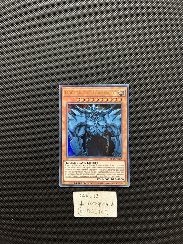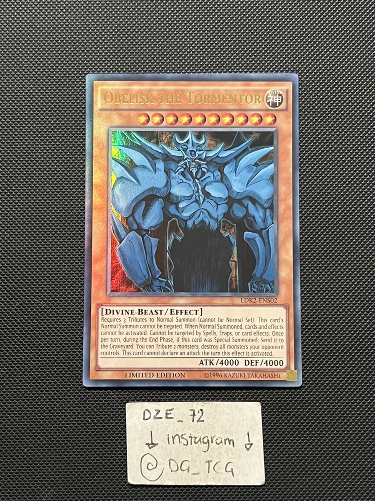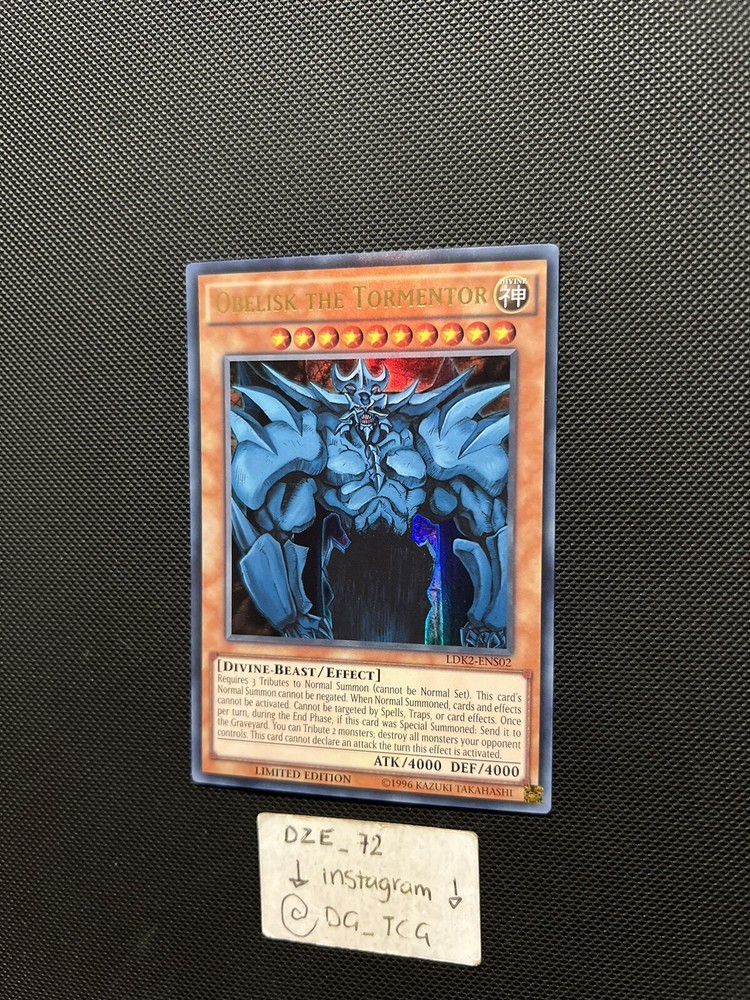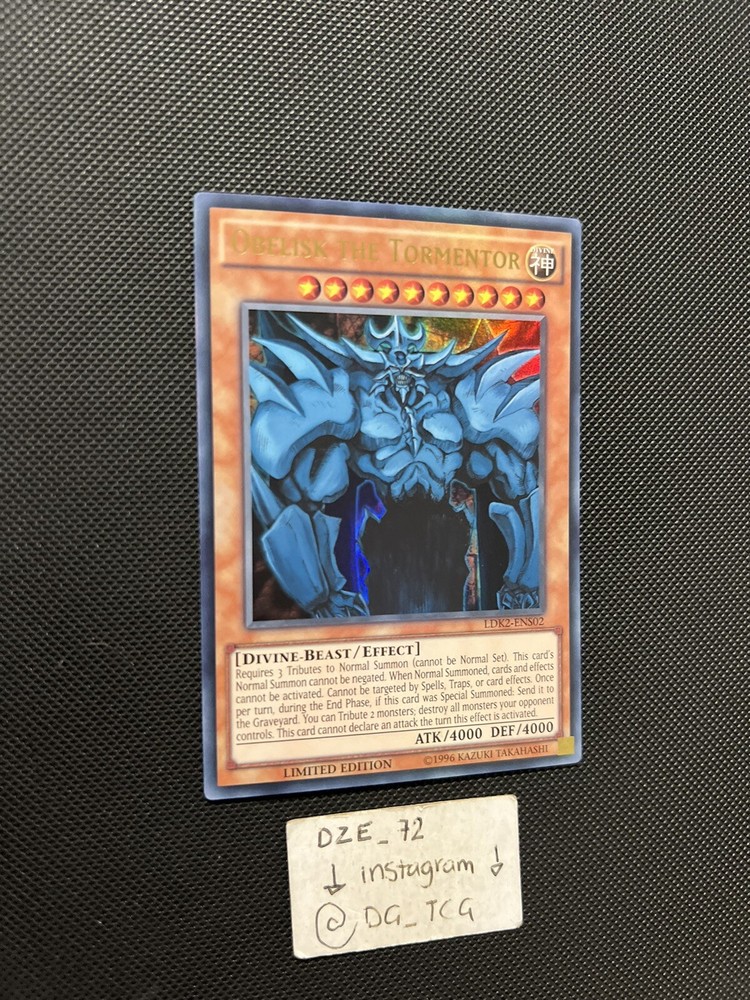 Yugioh - Obelisk The Tormentor Limited Edition - LDK2-ENS02 -UR- Limited Ed- NM. Condition - -8-8.5/10 - NM ⚠️COMES WITH NORMAL STANDARD SIZE ENVELOPE + TOP LOADED ⚠️ ⚠️ EXTRA $8,99 IF YOU WANT THE EXTRA PROTECTION + TRACKING & its Cardboard guarded / MAIL PADDED ⚠️ ( I DO COMBINED SHIPPING WITH ALL PURCHASES ) 📦 IF WANTED BULK MSG ME ON INSTAGRAM @DG_TCG 📲 🎉 GIVING BACK MONTH 🎉 BUY 5 + cards GET A SPECIAL GIFT & BUY 10+ cards GET A DOUBLE SPECIAL GIFT 🎉 Comes with sleeve / TOP LOADED ⚠️ Fast & Reliable Check my ebay account for more Yugioh & Pokemon & Football & NBA & UFC CARDS And MORE !!!!! ⚠️ Follow my Instagram for more card steals @dg_tcg ✅✅✅✅✅✅✅✅✅✅