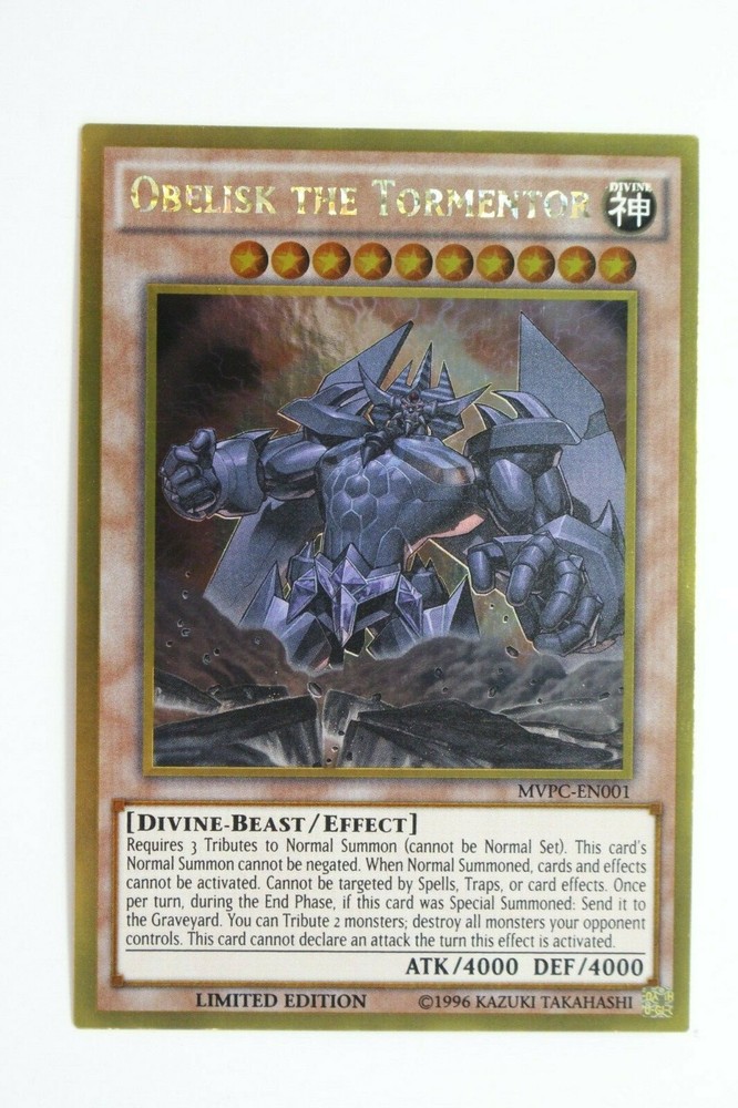 DETAILS: Yugioh Obelisk the Tormenter Limited Edition MVPC-EN001 Gold Rare LP Spend $25+ on sports or TCG singles and get free S&H (choose the option at checkout).