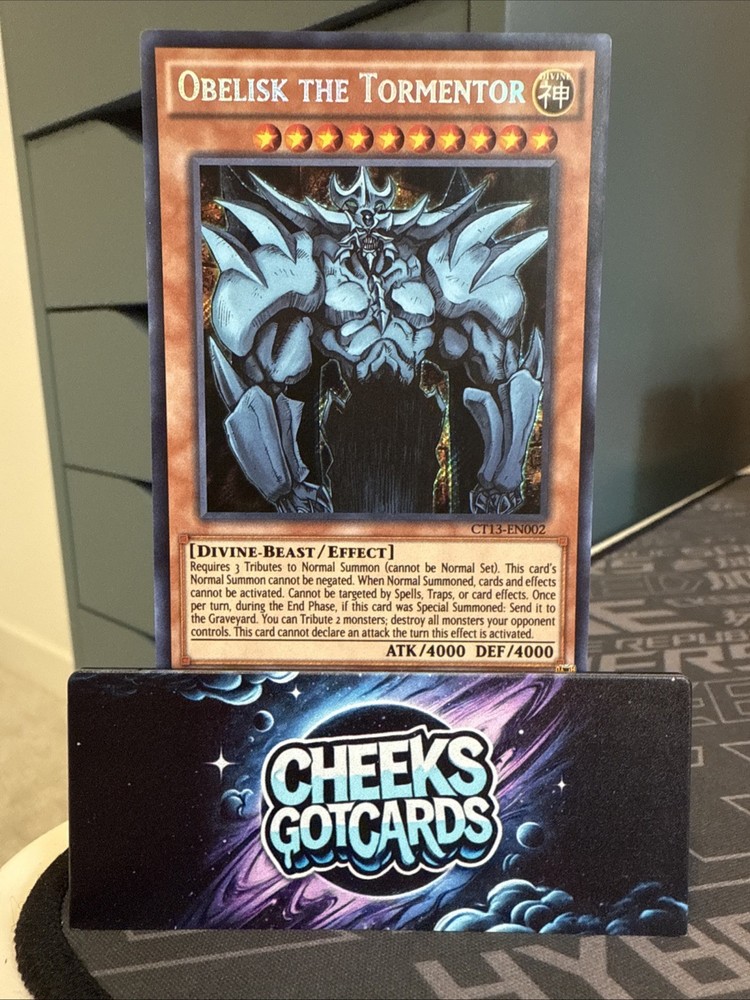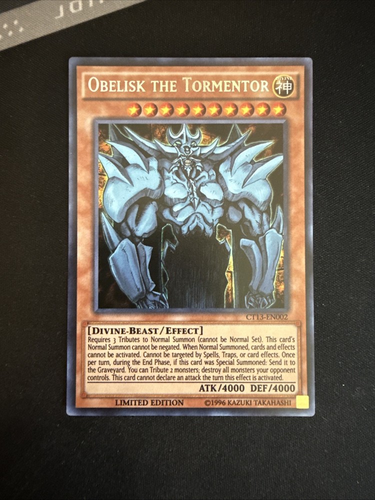 The Yu-Gi-Oh! Obelisk the Tormentor CT13-EN002 card is a highly sought-after collectible in the world of Yu-Gi-Oh! Trading Card Game. As a Secret Rare card manufactured by Konami, it holds value for both players and collectors alike. Being in the Monster category, this card is a key addition to any player's deck, bringing powerful abilities and strategic advantages to gameplay. With its rarity and desirability among fans, the Obelisk the Tormentor card is a valuable and sought-after item in the Yu-Gi-Oh! TCG community.
