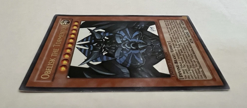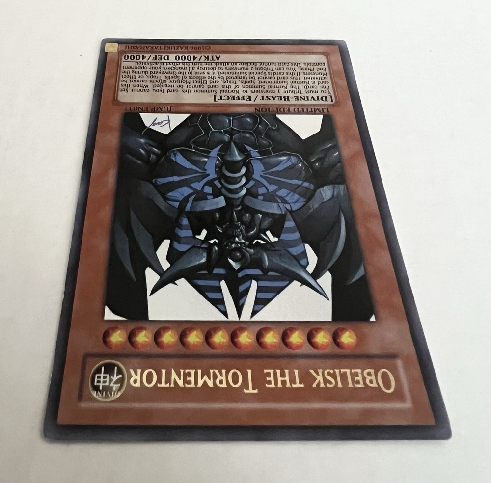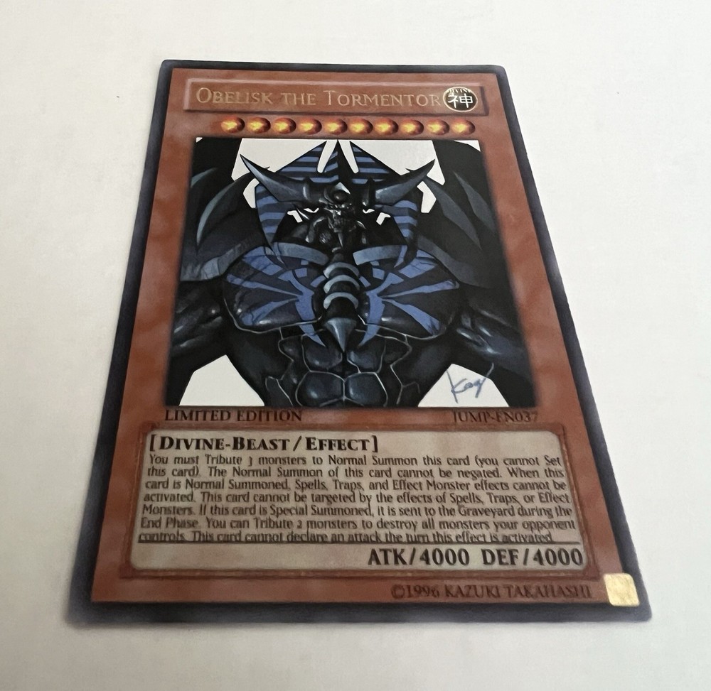 Yugioh Obelisk the Tormentor JUMP-EN037 Holofoil Limited Edition LP/MP Yu-GI-Oh Card was lightly played, but has a small dent on the left side, as pictured. Has light foiling on the edges. Except for the dent, the card is in good condition. Please see all photos for the exact condition, as this is the card you will receive. Will ship using eBay standard envelope shipping.