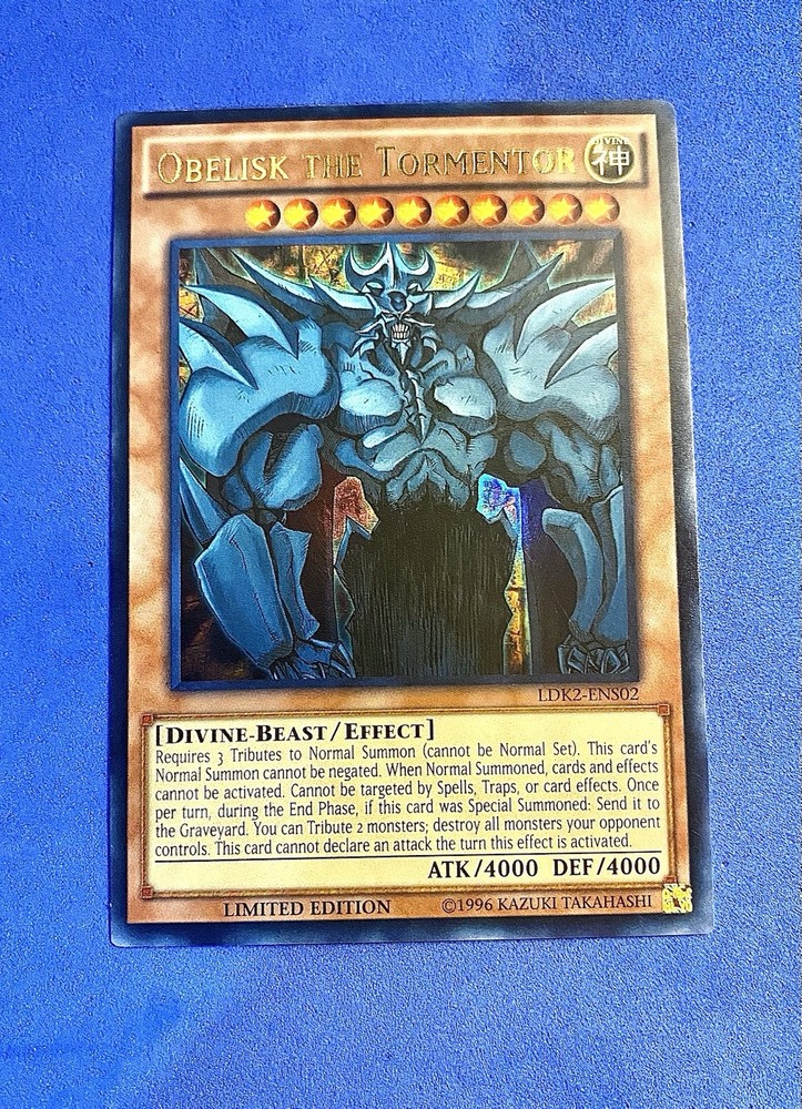 Elevate your Yu-Gi-Oh! TCG collection with the iconic Obelisk the Tormentor, a sought-after piece from the 2006 set. This Ultra Rare Limited Edition card, designated LDK2-ENS02, boasts a striking foil finish that captures the essence of its powerful, angelic creature type. A must-have for both seasoned collectors and players, Obelisk the Tormentor is a timeless addition that embodies the spirit of the game. Crafted with quality in mind by 1320, Inc, this English-language card remains a enigmatic treasure, with its origin unspecified. The card aligns with the Japanese card size standard and is made from durable aluminum material, ensuring longevity in your collection. Not autographed and suited for ages 4 and up, Obelisk the Tormentor promises to be a standout piece in any game or display.