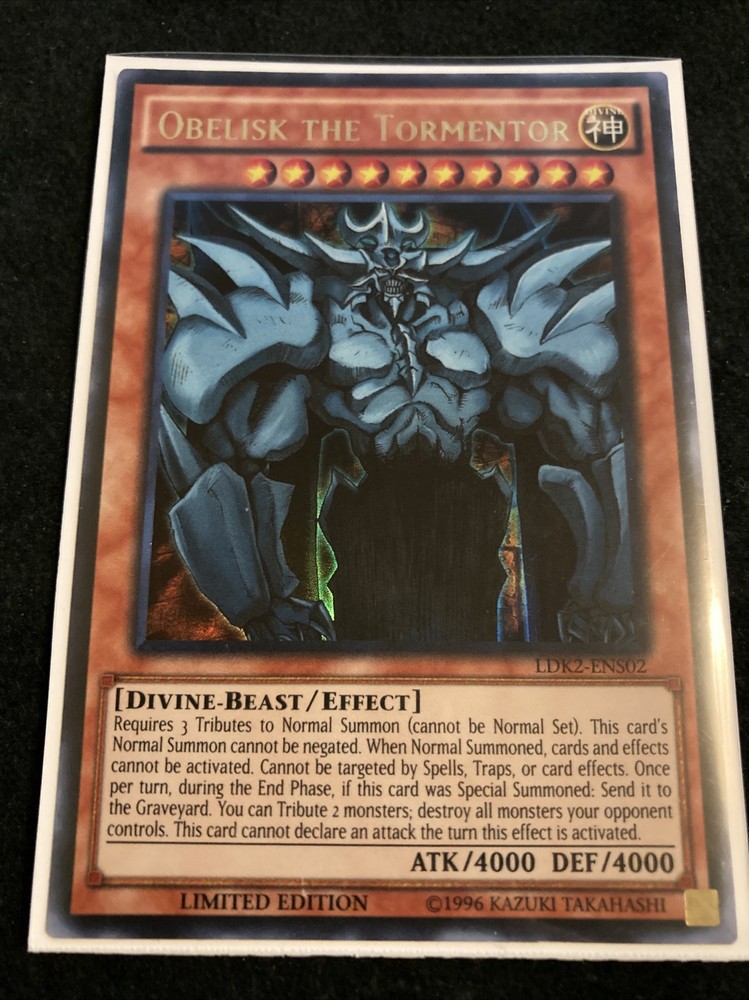 Obelisk the Tormentor Ultra Rare Near Mint Limited Edition Yugioh $ 5.28 Near mint!... Flower Bowl quantity Add To Cart Description Specifics Reviews (3) Description Near mint! Specifics Card Name Obelisk The Tormentor Features Limited Edition Game Yu-Gi-Oh! TCG Rarity Rare Reviews Rated 4 out of 5 AleksandrK8f Quick ship good seller, I did wanna provide feedback to use a cardboard to ship mats, got some nasty creased but was ultimately able to fix Rated 3 out of 5 rimshafd8a47 Item was shipped immediately and arrived exactly as described. Packaging was safe and secure! Seller was excellent with communication. Rated 3 out of 5 Divya Ponnusamy Exemplary seller: High quality transaction. Condition of item exactly as described.