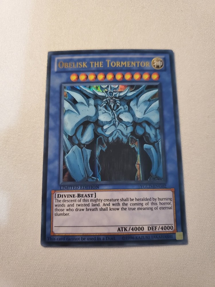 Yugioh - Obelisk the Tormentor YGLD-ENG02 NM Limited Ultra Rare Product This a Yugioh Product that is being sold! Condition is exactly as pointed out in title. For you're reference: NM: Near Mint VLP: Very Lightly Played LP: Lightly Played MP: Moderately Played HP: Heavily Played Shipping This listing will be shipped via card sleeve/penny sleeve and a top loader via letter mail. If you are purchasing an order of over $150 I will provide shipping with tracking free! Contact If you have any questions whether it be more pictures of the back or clarification on an order please contact me! We will do everything to Help! Also if you have multiple items or even have specific things you are looking for, reach out and we might just have it! There are no refunds, items are final sale! If the item has been incorrectly described or wrongly sent, please send images and we will sort it out right away! If the product has X2 or X3, it means it will either come with 2 of the same card or 3 of the same card. Be sure to always check the title of the listing! Great quality products that we ship across North America! Be sure to leave a review when you receive the item! Collection and Bulk Pokemon/Yugioh Purchases If you have any collections or bulk cards that you wish to sell please contact me and send pictures of what you're looking to sell! Rates: Contact me for rates! Reminder: I am looking to make profit when buying and selling, so please when reaching out realize that we both have to profit off the transaction!