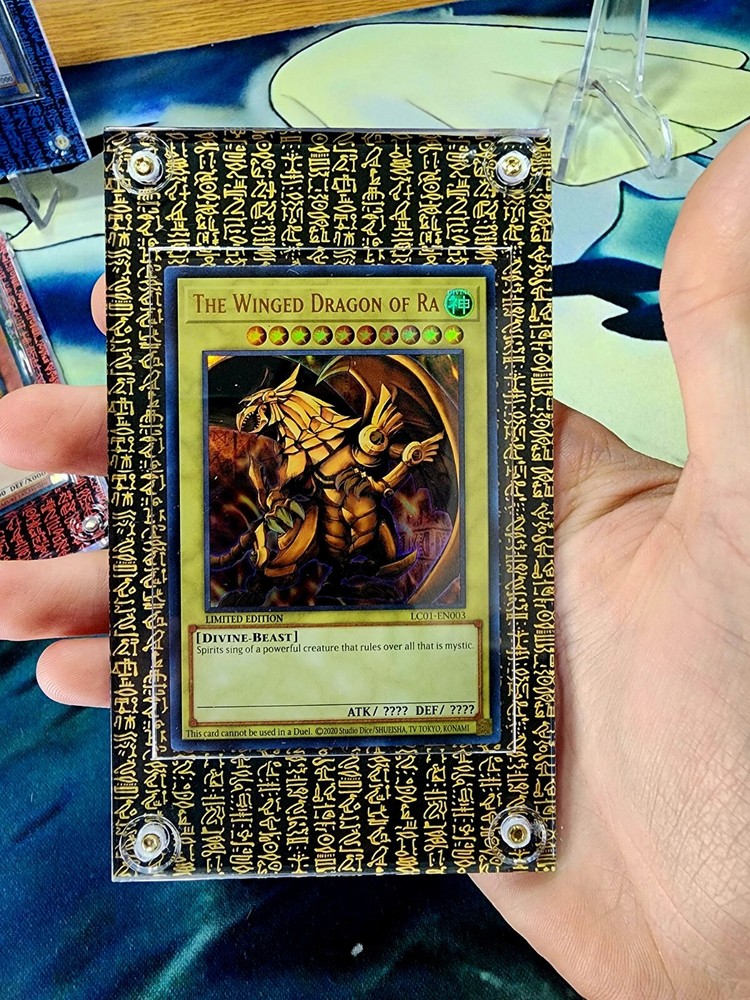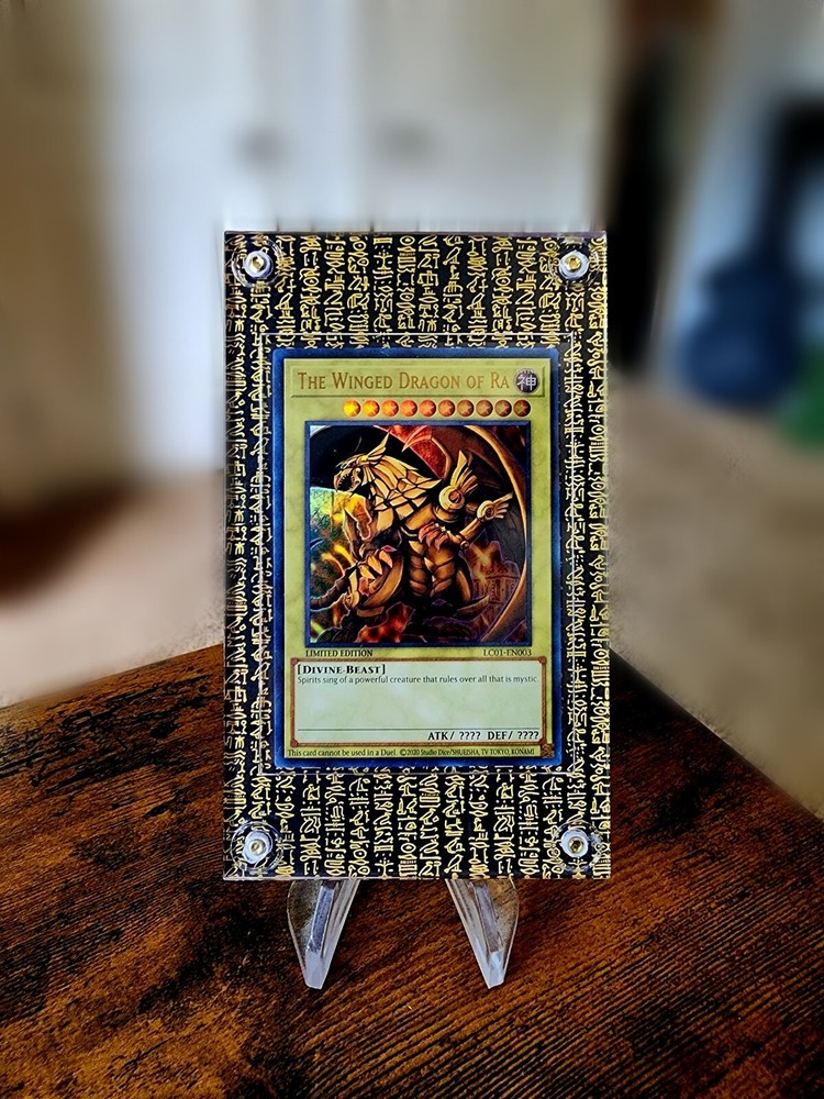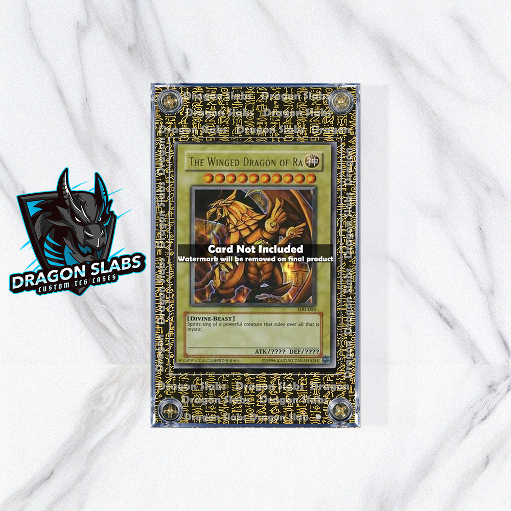 *Yugioh Card Not included* Yugioh Prismatic Hyrogliphics Winged Dragon of Ra Custom Case Slab Custom made prismatic yugioh hyrogliphics case. Includes the exact case and custom background pictured here. Does not include the card. The custom background is printed on a thick cardstock and makes a perfect extended artwork display of the card. It will come in a brand new case that has a recessed pocket for the card, so there is no damage to your card! Includes: Screwdown Case, Custom Background, a perfect fit yugioh card sleeve, and a perfect fit case sleeve. Will ship the same or next day secured in a small box! Check out all my other custom slabs. Let me know if you want anything custom made for any Pokémon or Yugioh card! I can make a custom bundle at a discount for you if you want multiple. I'm happy to work with you to give you the best price!