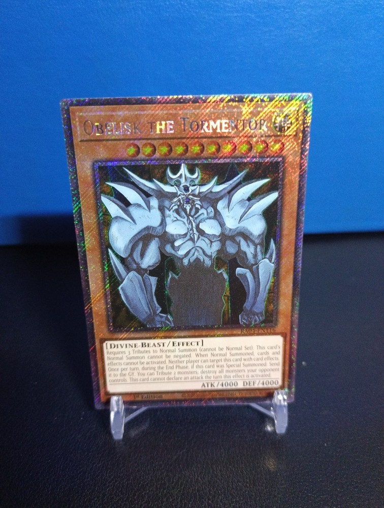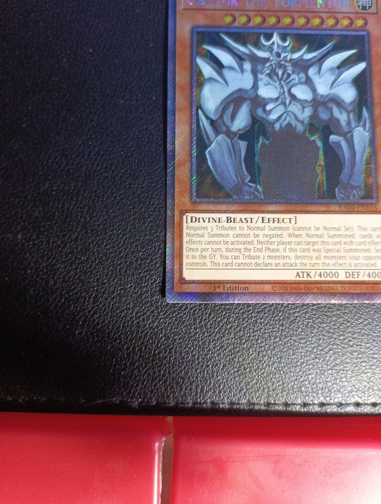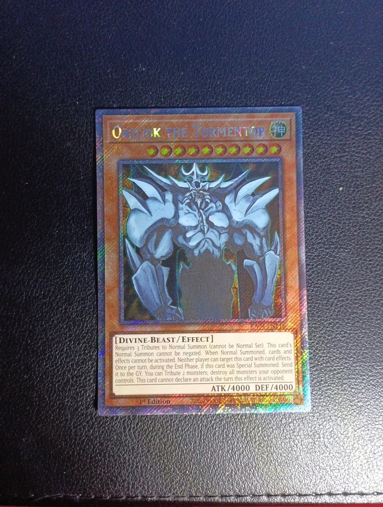 Elevate your Yu-Gi-Oh! collection with the majestic RA04-EN116 - Obelisk The Tormentor - Platinum Secret Rare card. This iconic piece is a must-have for both serious collectors and seasoned duelists looking to add a touch of power to their deck. Obelisk The Tormentor's Platinum Secret Rare status ensures it stands out with its stunning holographic design and premium finish. Whether used strategically in battle or displayed with pride, this card brings a blend of nostalgia and strength to any Yu-Gi-Oh! assortment. Don't miss the chance to own a slice of the game's history with this legendary card from the Platinum Secret Rare series.