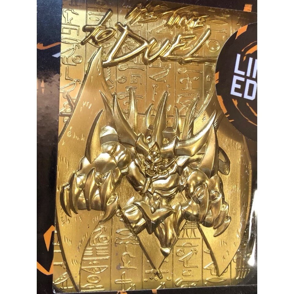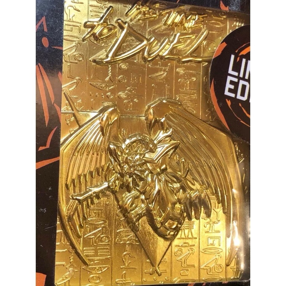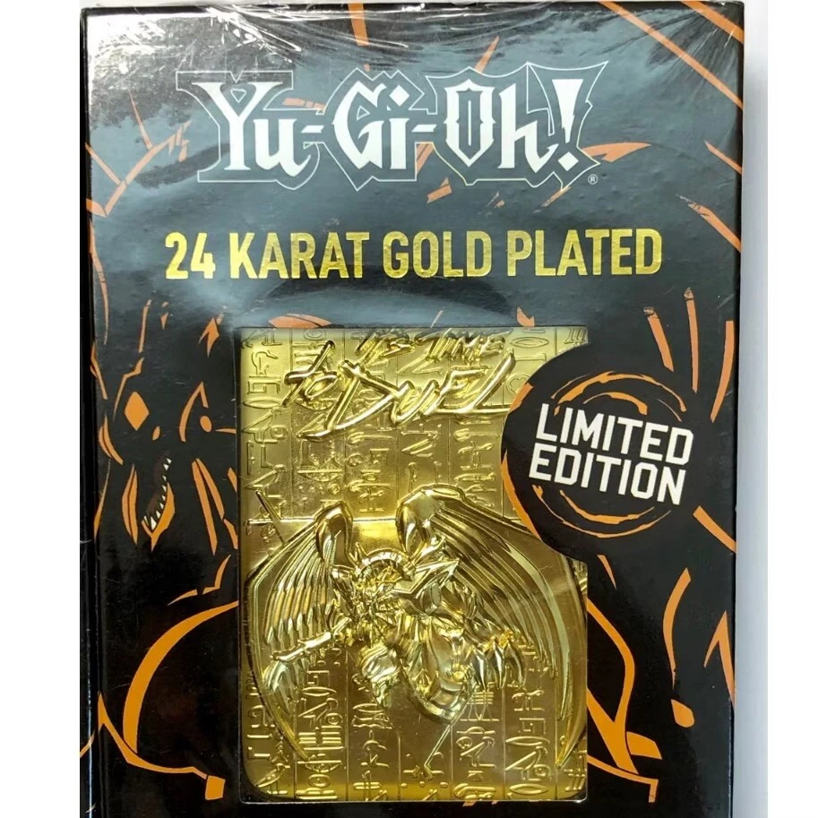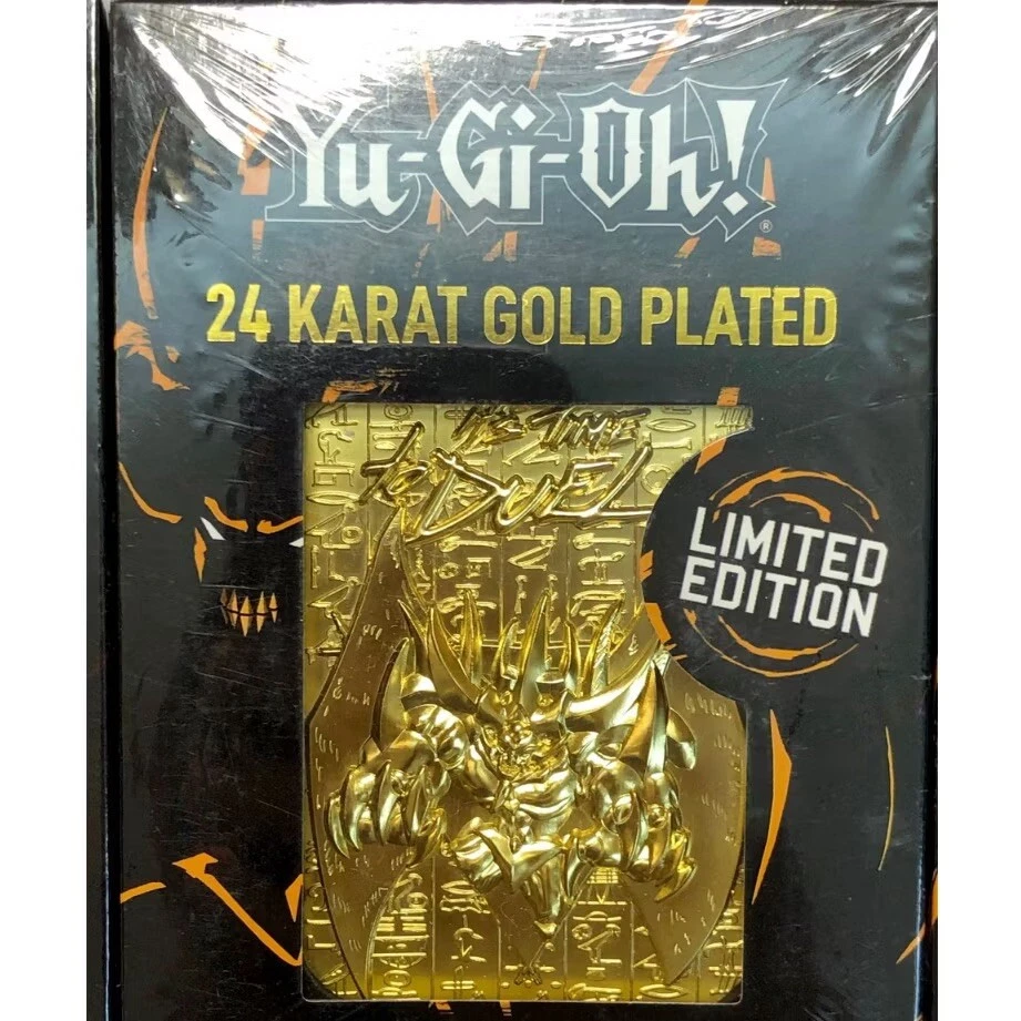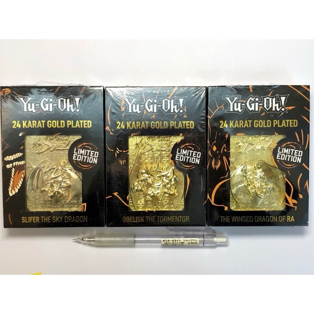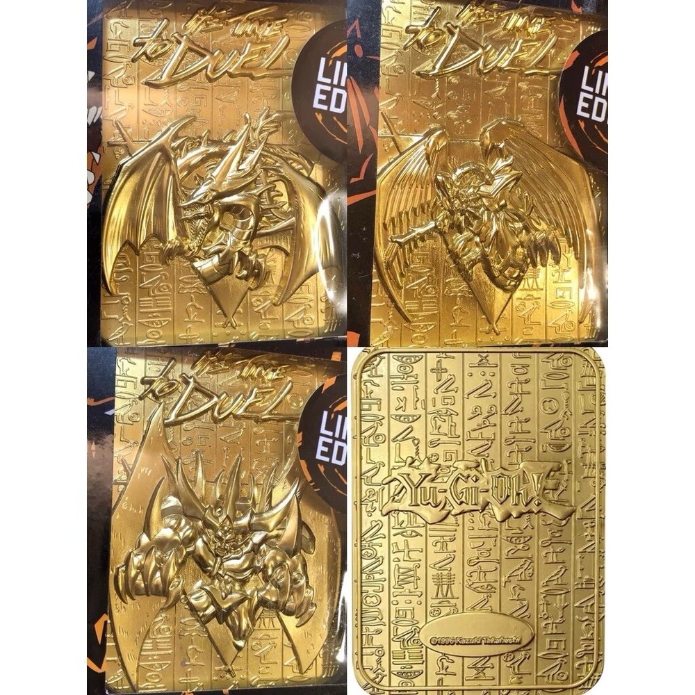 Set of 3 Yu-Gi-Oh Egyptian Gods 24 Karat gold plated metal cards New and sealed. Limited to 5000. Individually numbered. Display stand included. You will receive: -Slifer the Sky Dragon -The Winged Dragon of Ra -Obelisk the Tormentor