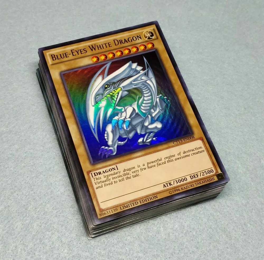 Hello all I am a New Ebay Seller!!! I am a Female Yugioh & Magic Collector!!! Happy Bidding!!! A bonus for ordering you will also Get a Free Holo Card from my collection. It maybe Super Rare, Ultra Rare, or SECRET Rare!!! Picture may have been edited due to Inventory Changes Please read description Below Item for sale is: Monster (21): 3 Blue Eyes White Dragon 1 Blue Eyes Shining Dragon 1 Obelisk the Tormentor 1 The King of D. 1 Kaiser Sea Horse 1 Kaiser Glider 1 La Jinn the Mystical Genie of the Lamp 1 Enraged Battle Ox 3 Vorse Raider 1 Blade Knight 1 Peten the Dark Clown 1 Vanguard of the Dragon 1 Twin-Headed Behemoth 1 Darkstorm Dragon 1 Goddess of Sweet Revenge 1 Tiger Dragon 1 Luster Dragon Spell (11): 1 Flash Fusion 1 Monster Reborn Reborn 1 Megamorph 1 Dragon Revival Rhapsody 1 Shrink 1 Burst Stream of Destruction 1 Silent Doom 1 Enemy Controller 1 Stamping Destruction 1 Dragonic Tactics 1 Beacon of White Trap (8): 1 Crush Card Virus 1 Loop of Destruction 1 Interdimensional Matter Transporter 3 Cloning 1 Shadow Spell 1 Tyrant Wing Fusion (1): 1 Blue-Eyes Ultimate Dragon
