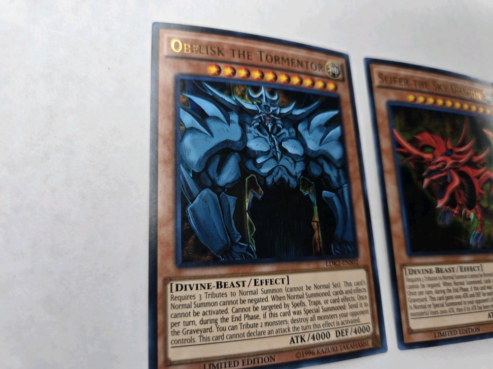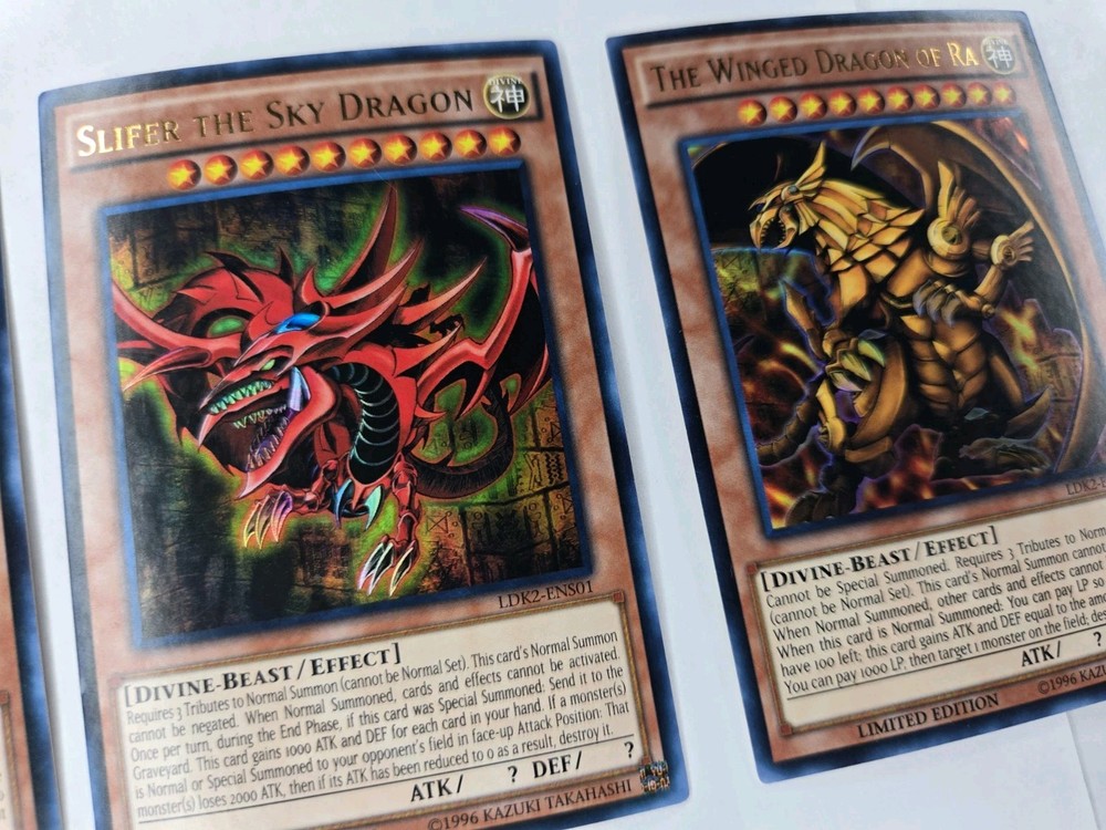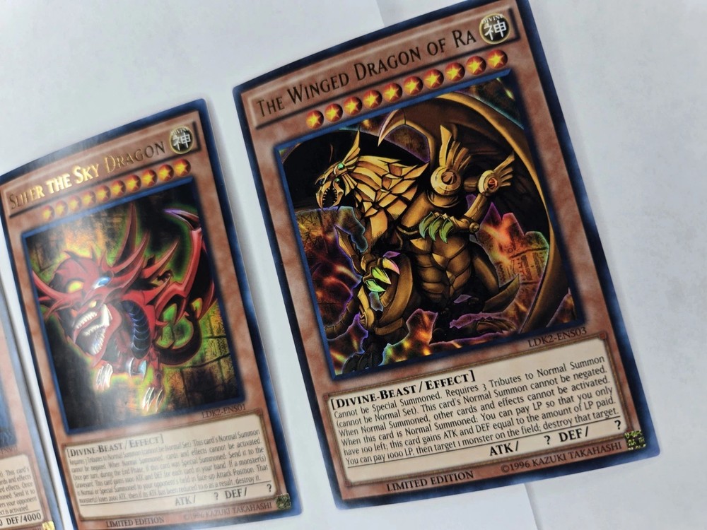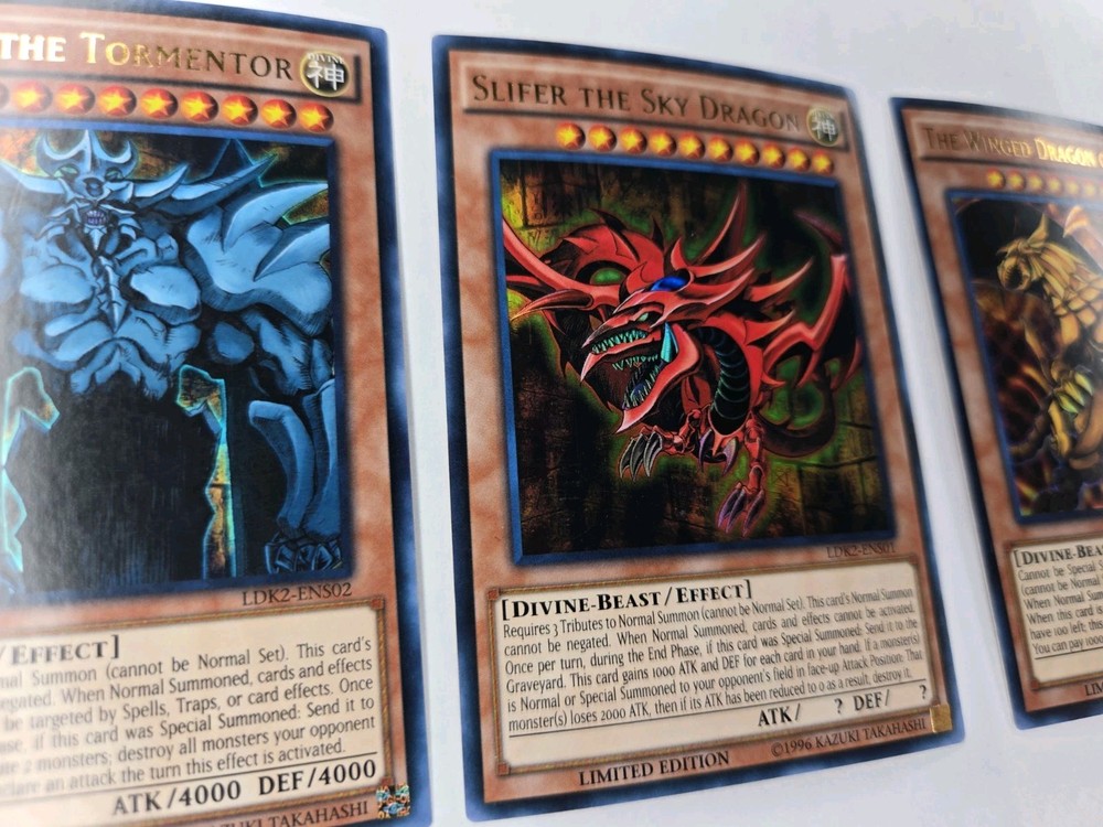 3x cards Penny sleeve and card saver included. Shipped USPS first class mail letter. This is a Yu-Gi-Oh! TCG God Set featuring the cards Slifer The Sky Dragon, Obelisk The Tormentor, and The Winged Dragon Of Ra. The set includes Ultra Rare Japanese cards with a Divine attribute and Holo finish, manufactured by Konami. The cards are part of the LDK2 series and are Unlimited edition. Autographed status and grading are unknown.