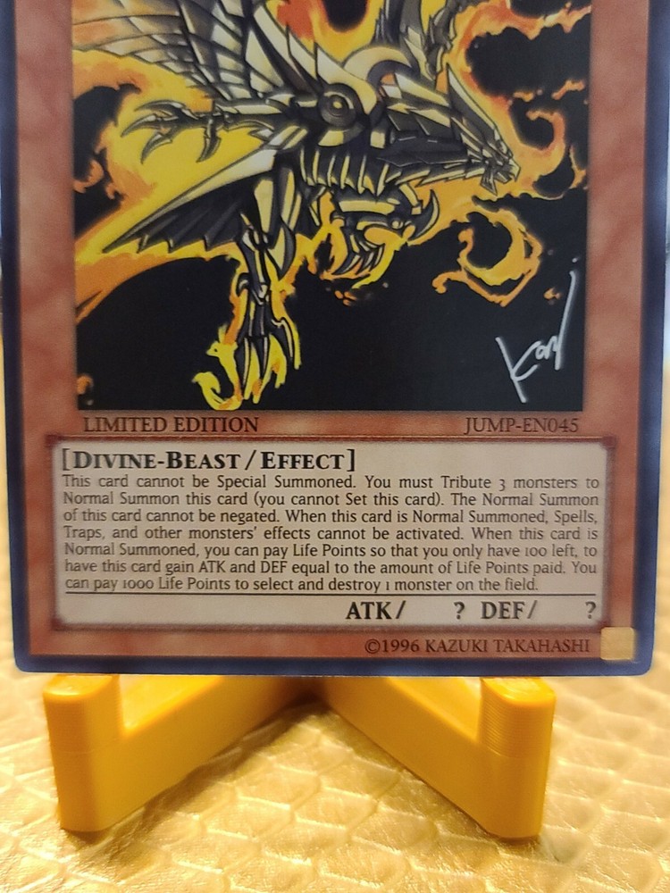 Yu-gi-oh! TCG The Winged Dragon of Ra JUMP-EN045 LIMITED EDITION. PLEASE SEE PICTURES FOR DEFECTS/FLAWS.PAYMENT: Payment must be received within 24 hours of auction end. If not received, item will be relisted. Buyer will also be reported to Ebay. Items will be shipped within 24-48 hours of payment received via Ebay. RETURNS: If you are not completely satisfied with the item, then please contact us with any issues you may have. We try our best to describe every item as accurate as possible, but sometimes things do get missed. We will work with you to make sure every transaction is a pleasant one. No returns on electronics. All electronics sold as is. Refund or exchange will be given if there was a mistake made or item not as described. Please Note: eBay fees and shipping and handling costs are Not refundable. FEEDBACK: Please leave feedback once you receive your item(s) so we know you received your item(s).We will leave feedback afterwards. PLEASE Contact Seller before leaving neutral or negative feedback for items lost or damaged during shipping. Please give us an opportunity to resolve the matter to your satisfaction. We DO NOT want you to be an unhappy with your purchase. QUESTIONS If you have a question or concern, I'm more than happy to help make sure you are satisfied with the item you paid for. I do my best to help and try to answer all emails received within 24 hours.