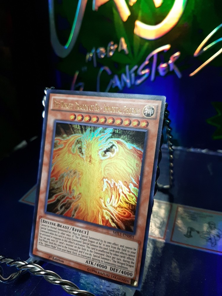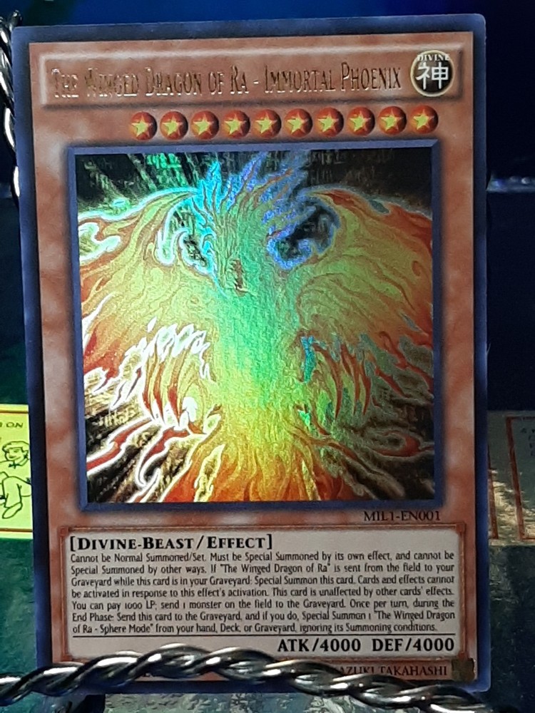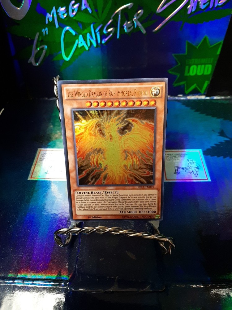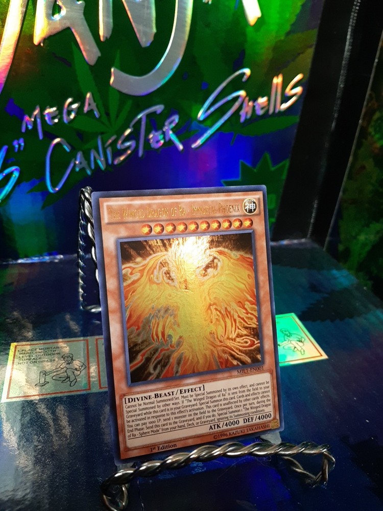 The product is a Yu-Gi-Oh! TCG card from the Millennium Pack set, featuring "The Winged Dragon of Ra" in its Immortal Phoenix form. This card is a Super Rare, 1st Edition, BREAK Speciality Effect card with a Divine-Beast Creature/Monster Type. The card is made of high-quality Card Stock material with a Foil finish, making it a vintage collectible suitable for ages 4 and above. Manufactured by Konami, this English language card is a valuable addition to any Yu-Gi-Oh! card collection.