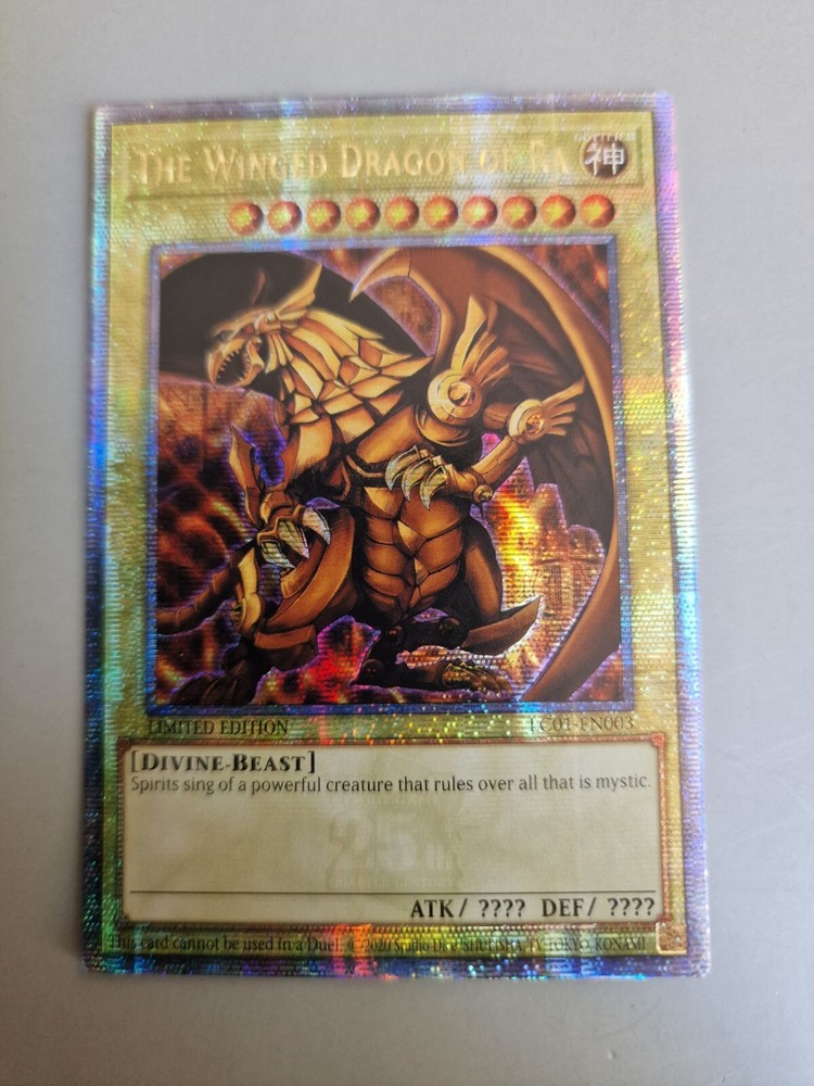 This limited edition quarter century secret rare card of The Winged Dragon of Ra from Yu-Gi-Oh! TCG is a must-have for any collector. With its stunning design and unique rarity, this card is sure to be a highlight of any collection. The card name, The Winged Dragon of Ra, speaks for itself as a highly sought-after card among Yu-Gi-Oh! enthusiasts. This card is perfect for those who are looking for a rare and valuable addition to their collectable card games collection. Whether you are a seasoned collector or a beginner, this card is an excellent choice for anyone who loves Yu-Gi-Oh! TCG. Don't miss out on this opportunity to own a piece of Yu-Gi-Oh! history! Any questions please feel free to ask please checkout my other great items