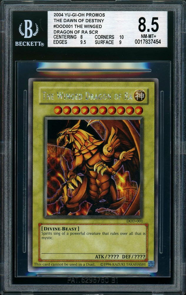Welcome to KnightotR1996! In this offer you`ll get a BGS8.5 Near Mint to Mint Graded The Winged Dragon of Ra Godcard in Secret Rare from the Dawn of Destiny Set in English. Please consider to take a look at my other offers, i always try to get more items listed Feel also free to find me elsewhere at KnightotR1996 Greetings Benni