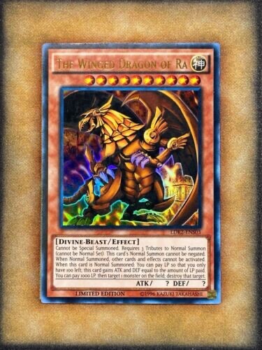 Elevate your Yu-Gi-Oh! TCG collection with the iconic The Winged Dragon of Ra card from the Legendary Decks II set. This Ultra Rare Limited Edition piece boasts a striking foil finish that captures the essence of the powerful Egyptian God in mesmerizing detail. The card features the unique BREAK speciality, allowing for a dynamic gameplay experience. A must-have for collectors and enthusiasts alike, this card is signed by 5ban Graphics and authenticated by Beckett Authentication Services (BAS), ensuring its authenticity and value. With its English language print and attribution to the AlienCon event, this card is a true gem from the year 1990, encased in aluminum for preservation.