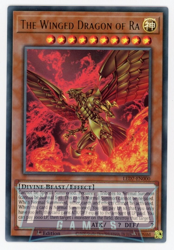 Yugioh The Winged Dragon of Ra LED7-EN000 Ultra Rare 1st Edition NM/LP Near Mint Condition - Straight from pack to sleeve. Due to manufacturing there can be inconsistencies in card condition. TierZero Games will always do our utmost to offer the most competitive prices on the market both on eBay and on our website. Card picture is an example of product - not the exact card you will receive. Please feel free to contact us with any questions or queries and thanks for shopping at TierZero Games.