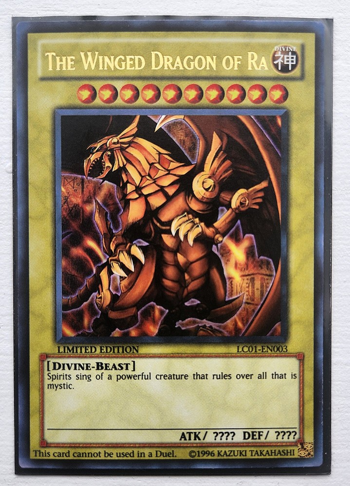 | Features | Limited Edition, Konami, Yugioh TCG, Released in 2010, Legendary Collection, Ultra Rare, LC01-EN003, The Winged Dragon of Ra |