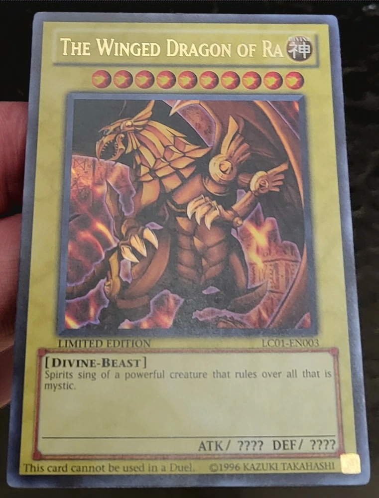 Thank you for taking your valuable time to read my description. You will receive the exact genuine and authentic Yu-Gi-Oh card that you see in the photos for this listing. You are purchasing an Ultra Rare Limited Edition The Winged Dragon of Ra LC01-EN003 from the Legendary Collection that was released in 2010 by Konami. Please refer to the photos for the condition of the card. If you require additional photos, please send me a message and I will provide you with the photos you need. Quality Shipping with maximum protection and it is free! Your order is very important to me, I package each order as if I were going to receive it myself and I know exactly how it feels to receive a damaged item (it is very disappointing). Your card will be handled with extreme care and delicacy. I make it a priority to provide the absolute best protection for your purchase. Your card will be inserted into a brand new plastic card sleeve, placed in a new hard plastic top loader, sealed inside of a new plastic team bag, properly set between 2 pieces of hand cut cardboard fit to match the top loader, wrapped in a layer of bubble wrap and mailed in a bubble padded mailer to ensure a safe delivery to your home. Same day Handling! Your order will ship the same business day that you place the order for orders placed before 5:00 PM (Eastern Standard Time) Mon-Fri. Your order will be shipped USPS 1st Class and tracking information is provided with your purchase. If you have any questions, send me a message and I will respond promptly. I appreciate your time, Thank you.