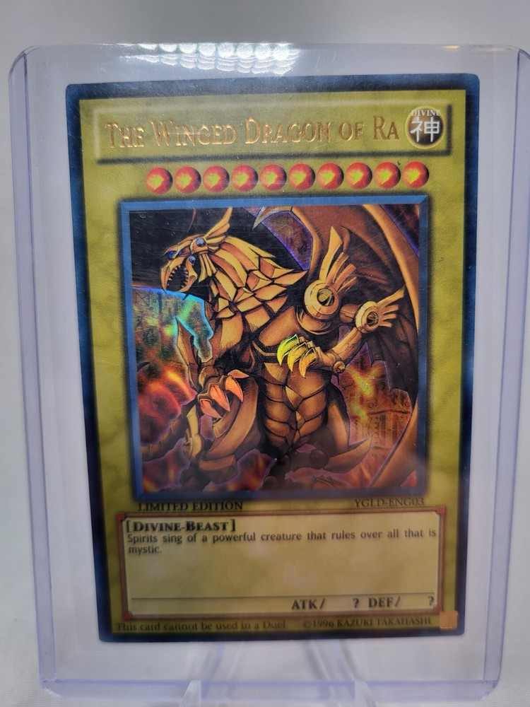 The Winged Dragon of Ra YGLD-ENG03 NM Limited Ultra Rare is a highly sought-after card in the Yu-Gi-Oh! TCG game. With its ultra-rare status, this card is a must-have for any collector or player. The card features a stunning design and is in excellent shape, making it a great addition to any collection. This limited edition card is a true gem for any Yu-Gi-Oh! fan. Its rarity and impressive design make it a valuable addition to any collection. Don't miss out on the chance to own this incredible card. The card you will receive is exactly the one depicted. It comes in a sleeve and top loader as depicted. Is shipped with tracking.