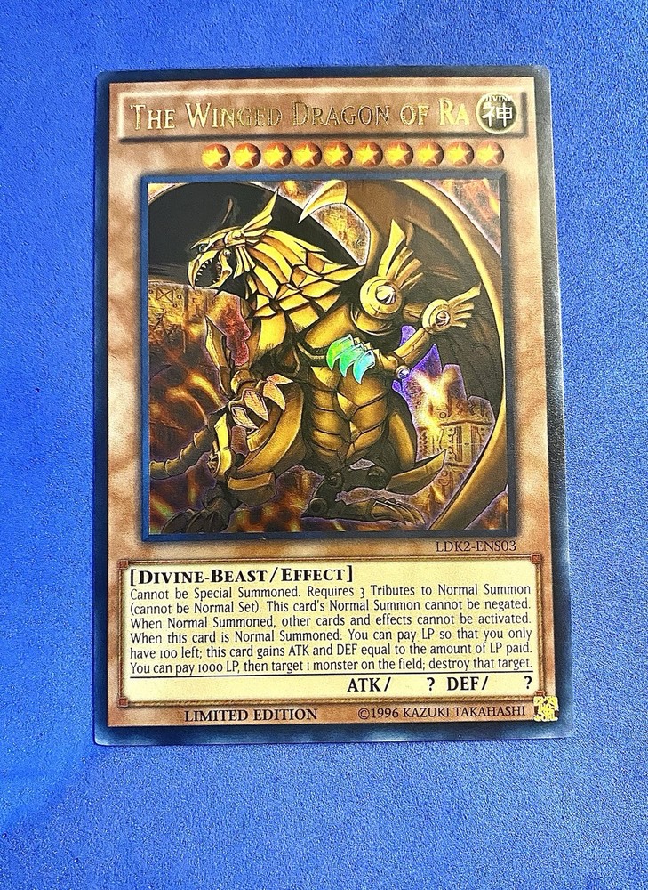 Elevate your Yu-Gi-Oh! TCG collection with the majestic Winged Dragon of Ra, a Limited Edition gem from the 2006 set. This particular card, LDK2-ENS03, boasts the allure of a foil finish, capturing the essence of this iconic creature in stunning detail. As a 10000 Secret Rare card, it stands as a must-have for collectors and duelists alike, promising to be a centerpiece in any assortment. Crafted with the highest quality materials, the card's aluminum construction ensures durability and longevity. While it's a basic stage Artifact card, the Winged Dragon of Ra brings with it the might of an Angel creature type, able to synergy with various deck builds for a powerful in-game impact. Its English language and Japanese card size make it suitable for international play and collecting.
