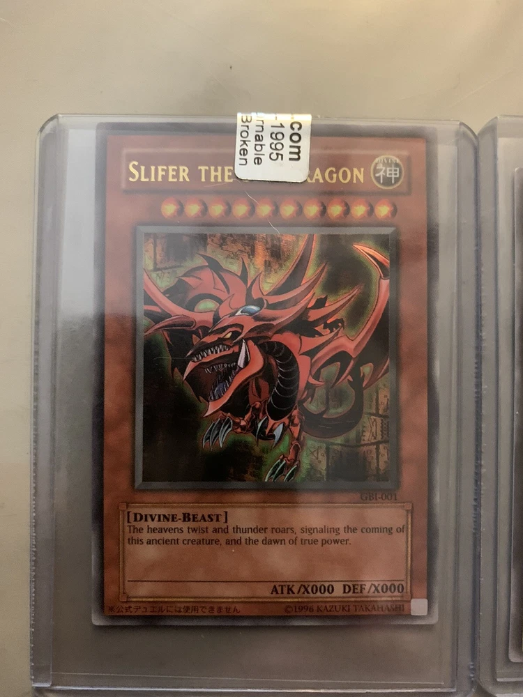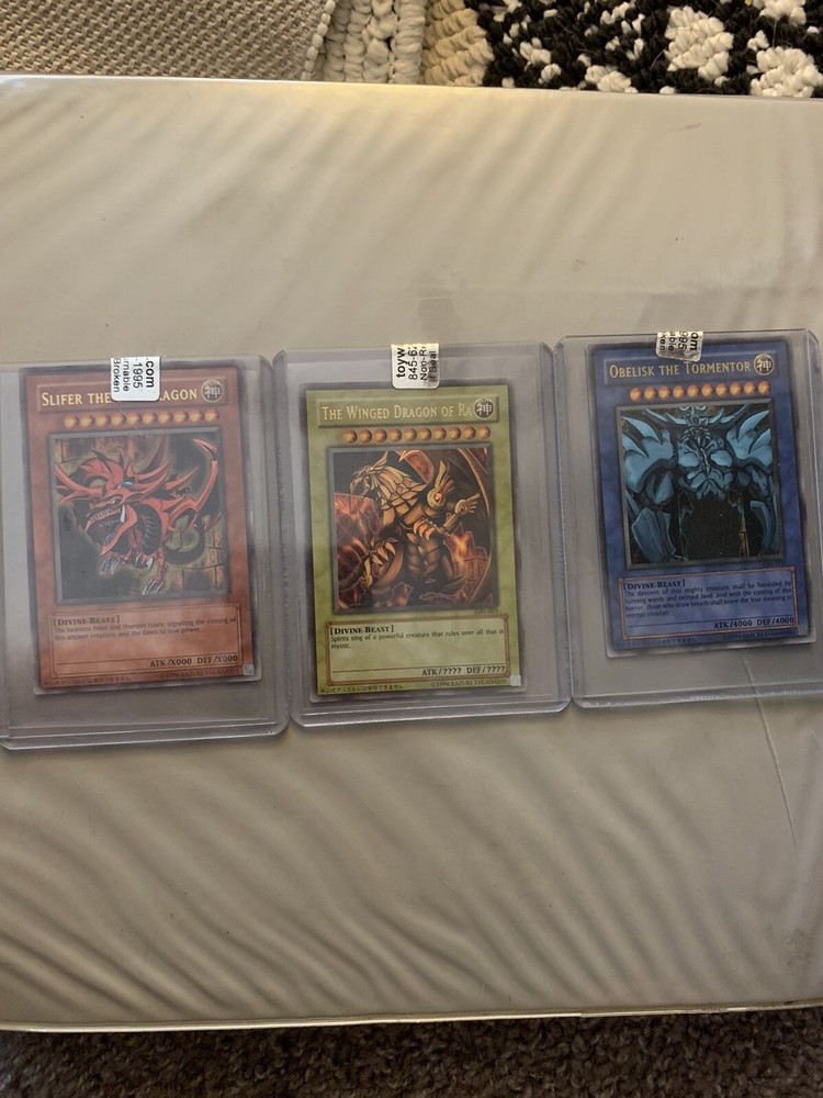 Unleash the power of the Egyptian God Cards with this exclusive set of three Ultra Rare Promo cards from the Yu-Gi-Oh! TCG. These holo cards, featuring The Winged Dragon Of Ra, Oblisk The Tormentor (GBI), and Slifer The Sky Dragon, are a must-have for any serious collector or duelist. Embrace the might of Divine-Beasts and elevate your game with these iconic cards from the classic 1996 Game Boy series. Each card, numbered GBI-001, GBI-002, and GBI-003, boasts a stunning holographic finish that captures the eye and adds a divine touch to your collection. Crafted by Konami, these English language cards are perfect for anyone aged 6 and up. Secure this vintage bundle and wield the awe of the Egyptian God Cards in your next adventure.