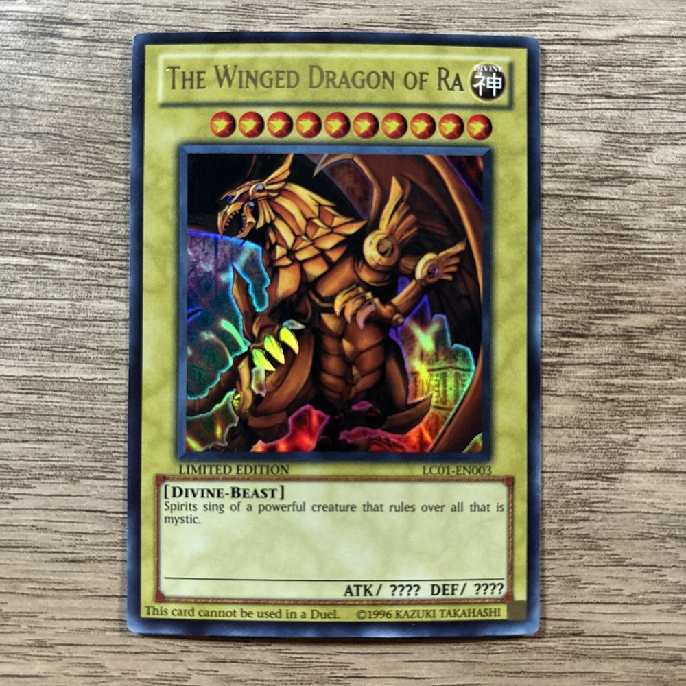 This Yu-Gi-Oh! card is a limited edition Quarter Century Rare featuring the Winged dragon of Ra. The card is from the Yu-Gi-Oh! Legendary Collection and has the card number LC01-EN003. It is a monster card with the attribute Divine-Beast and a rarity of Quarter Century Rare. The card is not autographed and comes from the manufacturer Konami. This card is perfect for collectors and players of the Yu-Gi-Oh! TCG.