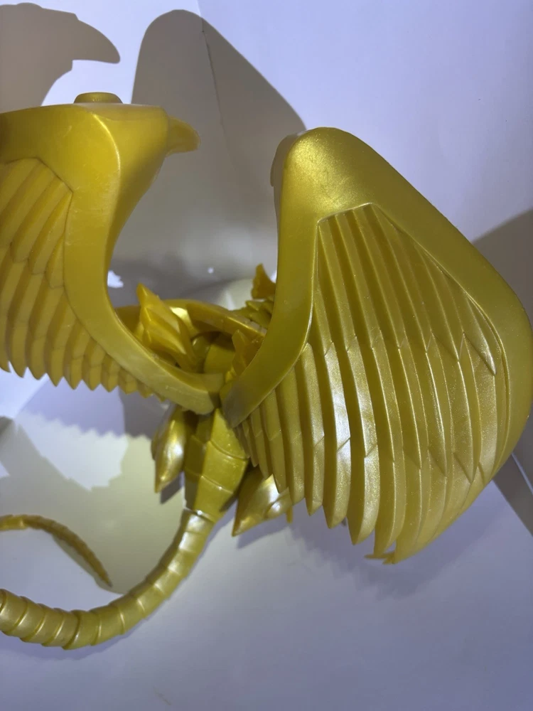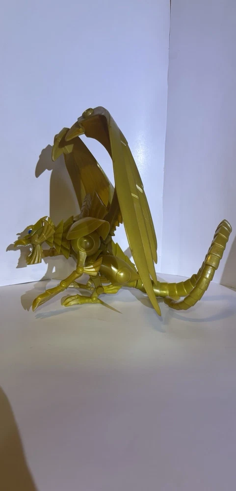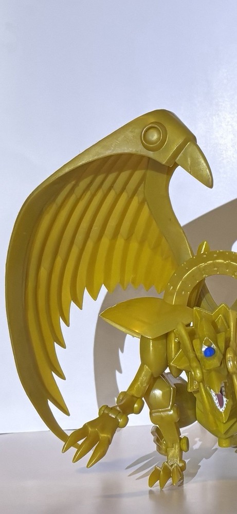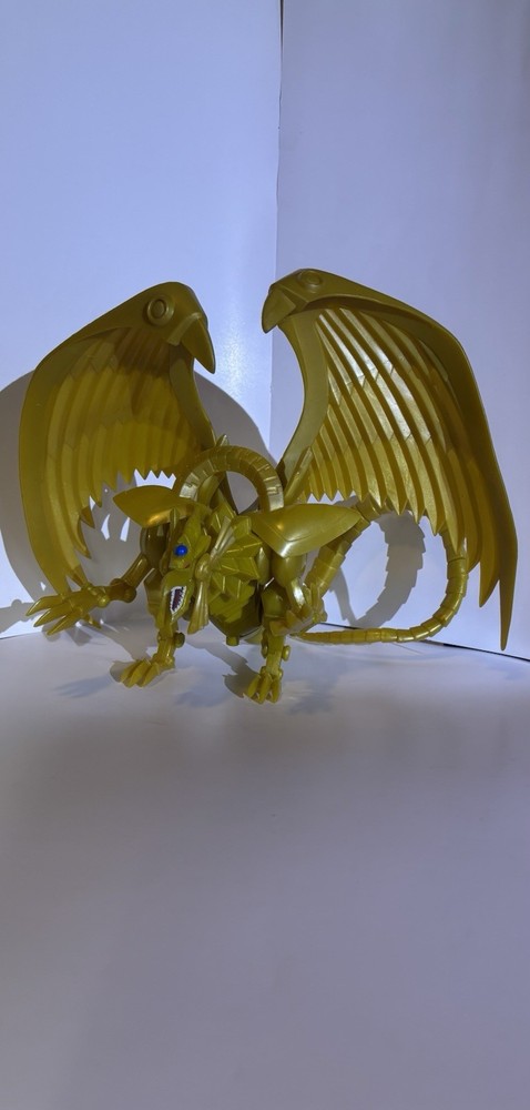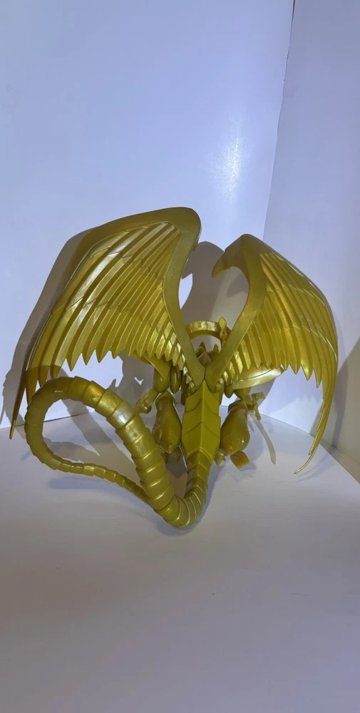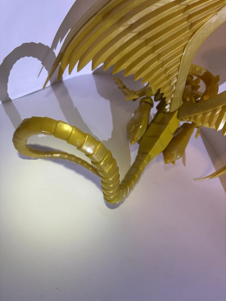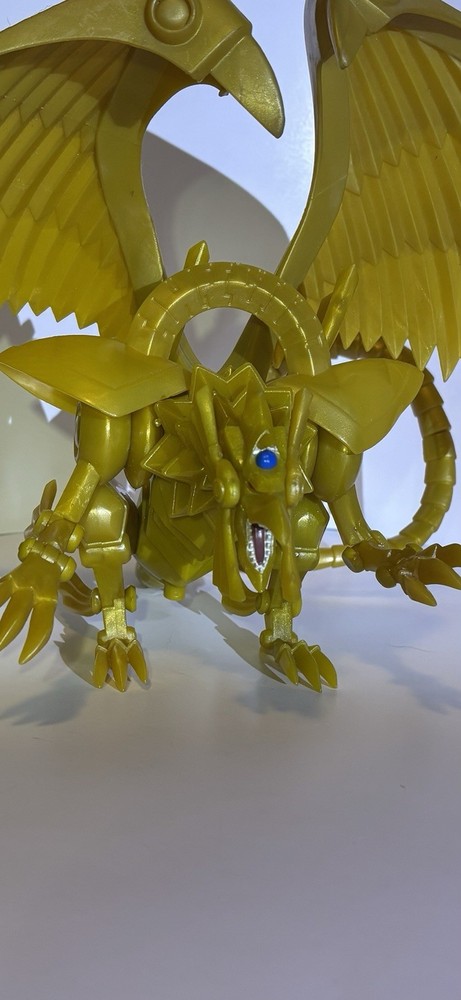 Elevate your collection with the majestic Winged Dragon of Ra model figure by Mattel. One of the three legendary Egyptian gods . A must-have for fans of the iconic Yu-Gi-Oh! franchise, this piece captures the essence of power .The figure boasts a striking gold color. ITEM HAS ONE SLIGHTLY BENT WING AND TWO RIGHT LEGS FROM THE KNEE DOWN MEANING THAT ONE OF THE ANKLE FINS IS ON THE INSIDE OF ANKLE ON LEFT LEG WHEN SHOULD BE ON OUTSIDE (as seen in pictures ) THE ITEM ALSO HAS NO STAND