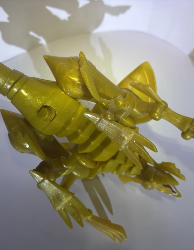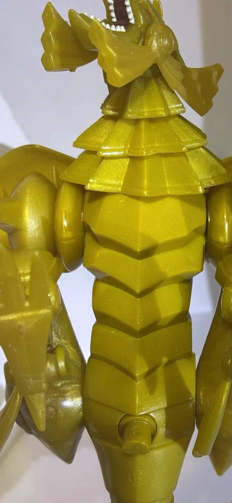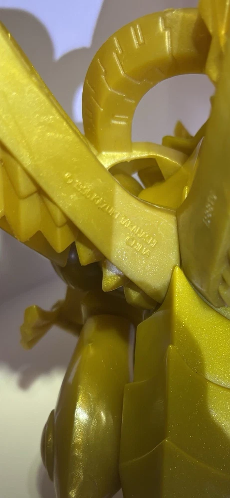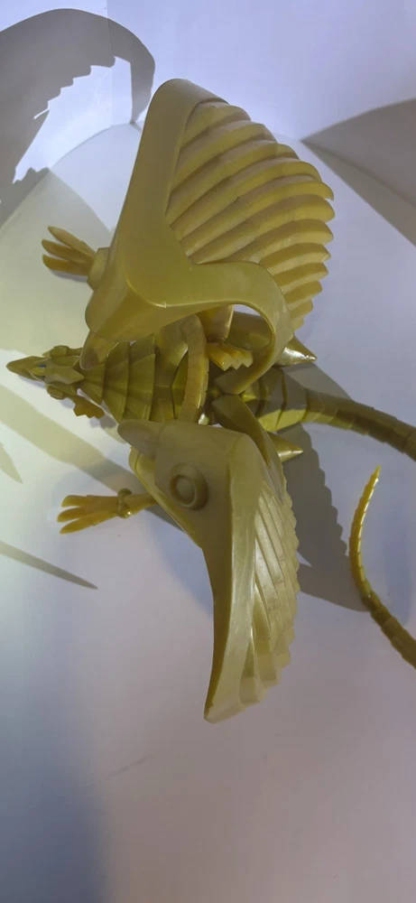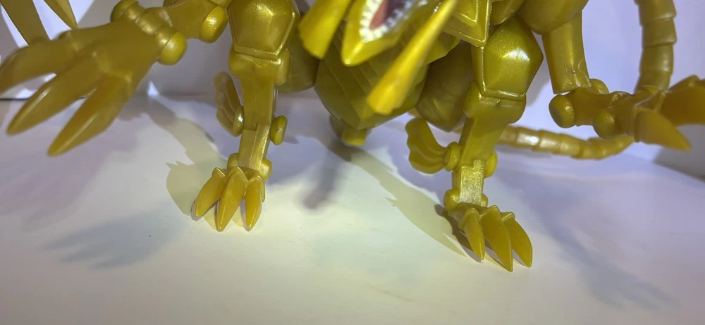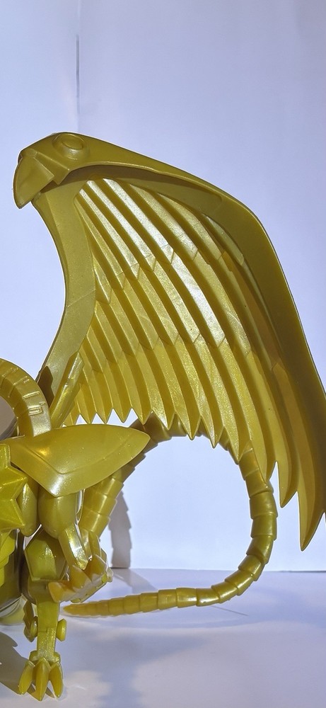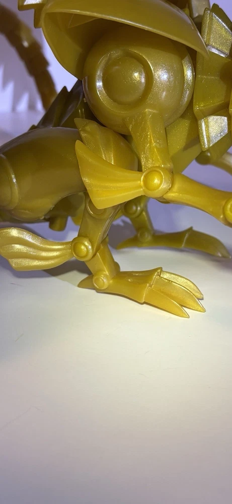 Elevate your collection with the majestic Winged Dragon of Ra model figure by Mattel. One of the three legendary Egyptian gods . A must-have for fans of the iconic Yu-Gi-Oh! franchise, this piece captures the essence of power .The figure boasts a striking gold color. ITEM HAS ONE SLIGHTLY BENT WING AND TWO RIGHT LEGS FROM THE KNEE DOWN MEANING THAT ONE OF THE ANKLE FINS IS ON THE INSIDE OF ANKLE ON LEFT LEG WHEN SHOULD BE ON OUTSIDE (as seen in pictures ) THE ITEM ALSO HAS NO STAND