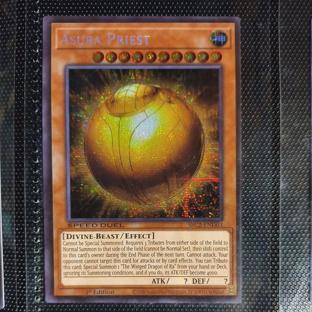 Battle City Finals misprint Winged Dragon of Ra, Sphère Mode. Asura Priest name printed on card with Ra artwork and text. Lvl 10 Atk: ? Def: ? Divine Beast/Effect will be shipped with a hard sleeve fo...