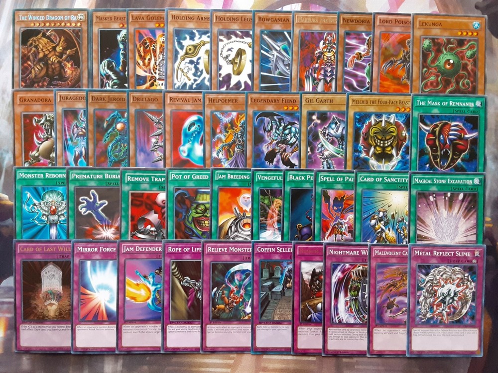 Item Description All cards are in NM Near Mint Condition. All cards included have been used by Yami Marik in the TV Show and official Konami Yugioh Video Games. Monsters x19 - 1x The Winged Dragon of Ra (Secret Rare) 1x Masked Beast Des Gradius 1x Lava Golem 1x Holding Arms 1x Holding Legs 1x Bowganian 1x Makyura the Destroyer 1x Newdoria 1x Lord Poison 1x Lekunga 1x Grandora 1x Juragedo 1x Dark Jeroid 1x Drillago 1x Revival Jam 1x Helpoemer 1x Legendary Fiend 1x Gil Garth 1x Melchid the Four-Faced Beast Spells x11 - 1x Mask of Remnants 1x Monster Reborn 1x Premature Burial 1x Remove Trap 1x Pot of Greed 1x Jam Breeding Machine 1x Vengeful Bog Spirit 1x Black Pendant 1x Spell of Pain 1x Card of Sanctity 1x Magical Stone Excavation Traps x10 - 1x Card of Last Will (Ultra Rare) 1x Mirror Force 1x Jam Defender 1x Rope of Life 1x Relieve Monster 1x Coffin Seller 1x Hidden Soldiers 1x Nightmare Wheel 1x Malevolent Catastrophe 1x Metal Reflect Slime All items are in mint/near mint condition unless otherwise specified in the title or description. This listing is for the items named in the title and pictured here. What you see in the picture is what you will receive.