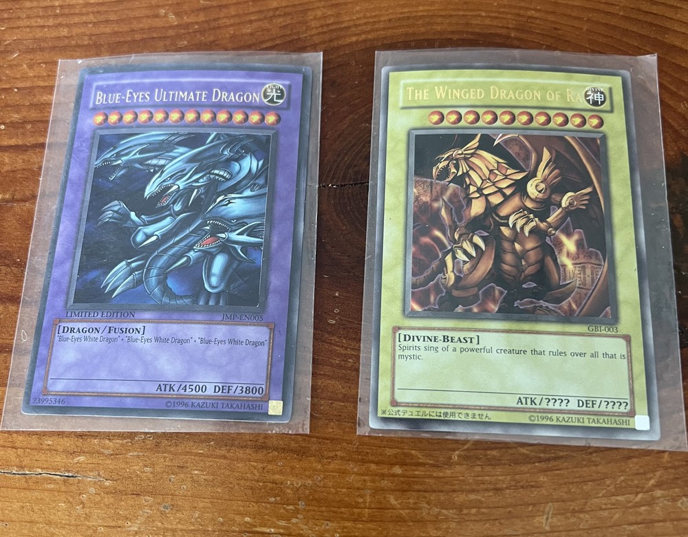 Yugioh cards The Winged Dragon of Ra and Blue Eyes Ultimate Dragon These look like they are in excellent condition....
