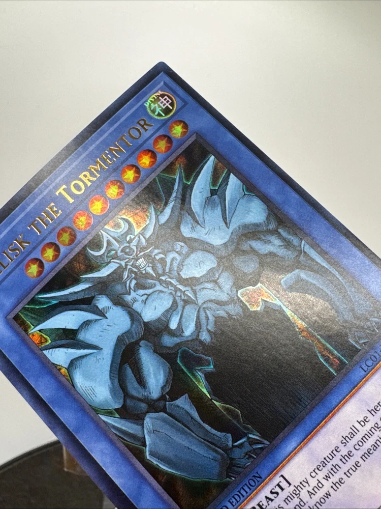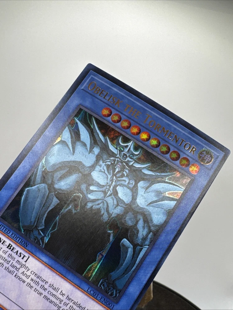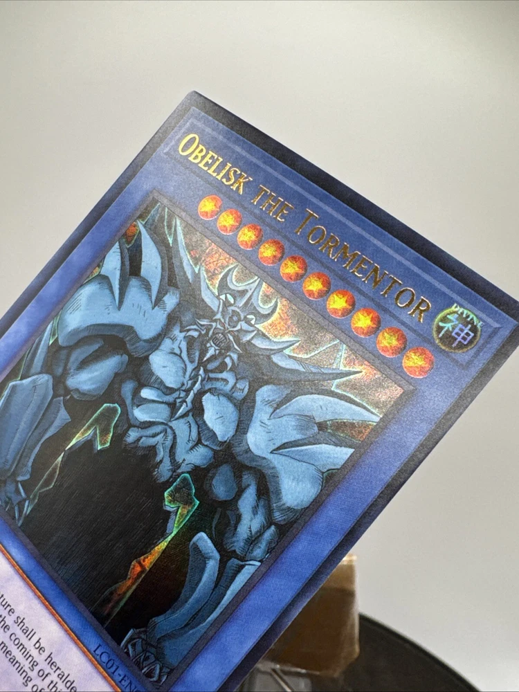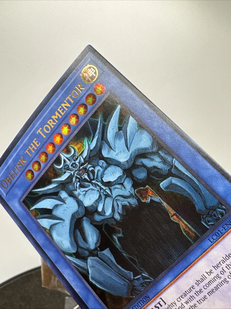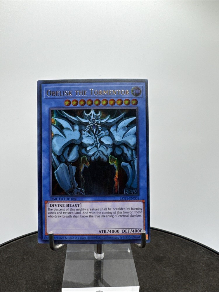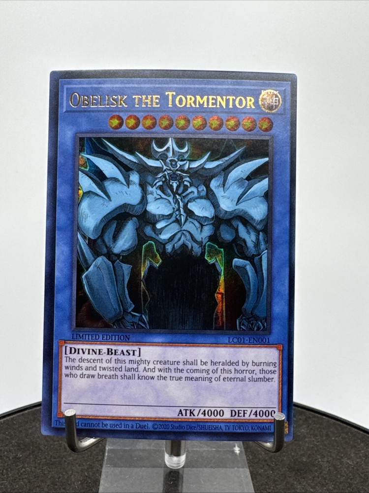 Elevate your Yu-Gi-Oh! TCG collection with the iconic Obelisk the Tormentor, a must-have for both serious collectors and seasoned duelists. This ultra rare monster card, from the Rarirty Collection, boasts the prestige of being a 1st Edition release, ensuring its place as a standout piece in your assemblage. Crafted with precision by Konami, the card's English language versatility allows for seamless integration into your existing deck. LC01-EN001 is the unique identifier for this collectible, which remains unautographed and has not been tampered with, preserving its originality and value. Add Obelisk the Tormentor to your collection and experience the might it brings to your battles.