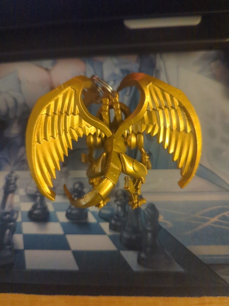 The product is a Yu-Gi-Oh! backpack hanger keychain featuring The Winged Dragon of Ra. Made by Surreal Entertainment in 2022, this figurine showcases one of the iconic characters from the Yu-Gi-Oh! franchise. The keychain is designed in gold color and depicts a detailed representation of The Winged Dragon of Ra, adding a touch of collectible animation merchandise to any fan's collection. Made in China, this keychain is a must-have for Yu-Gi-Oh! enthusiasts looking to showcase their love for the series on their backpack or keys. Never used but displayed on a desk
