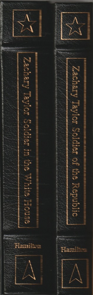 2 volumes: Zachary Taylor Soldier of the Republic and Zachary Taylor Soldier of the White House. Full black leather with gilt decorative design, all edges gilt, satin ribbon marker, and silk moire endpapers. Smyth-sewn and bound in top-grain leather with raised bands on spine. Printed on specially milled acid-neutral paper. A beautiful set. Collector's Edition - Library of the Presidents.