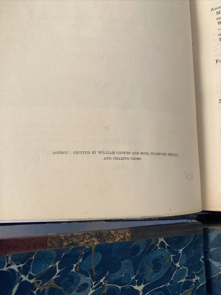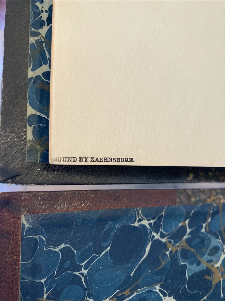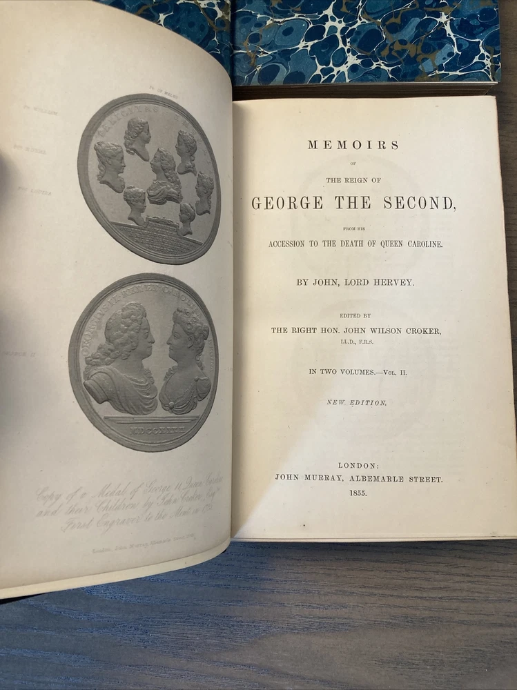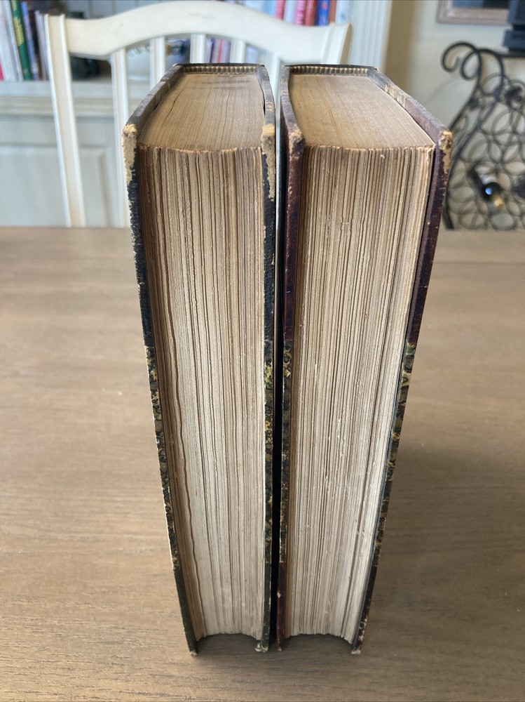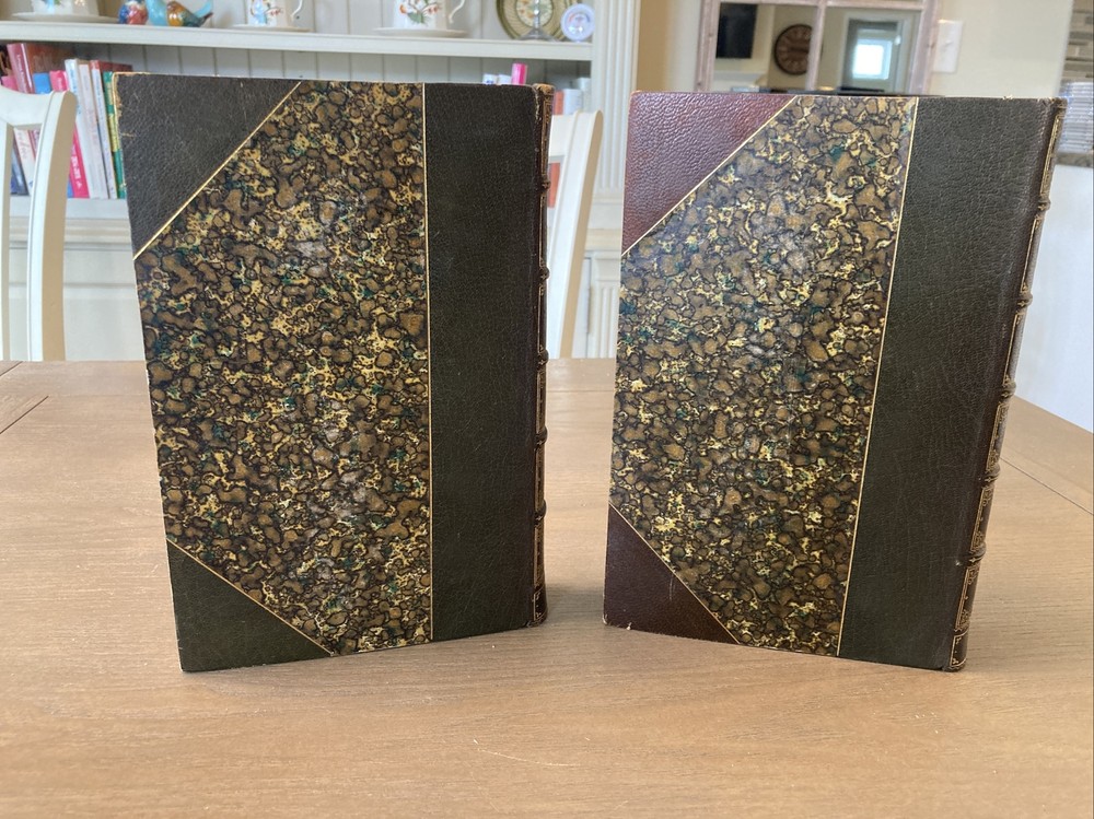 Beautiful set of antique leather books, “bound by Zaehnsdorf.” Memoirs of the Reign of George the Second, from his Accession to the Death of Queen Caroline. 1855, London John Murray. By John, Lord Hervey. New Edition in two volumes. Edited by the Right Honorable John Wilson Crocker. Bound in half Morocco, as specified by some old book sellers notations tucked into the back. Very handsome set of books, decorative boards and end papers. Leather is in good condition, not cracking, hinges are completely intact inside and out. I can provide more photos if necessary. Each book is a bit under 600 pages, 6 x 9. International shipping is available and if you have any questions please message me, I am always happy to help.