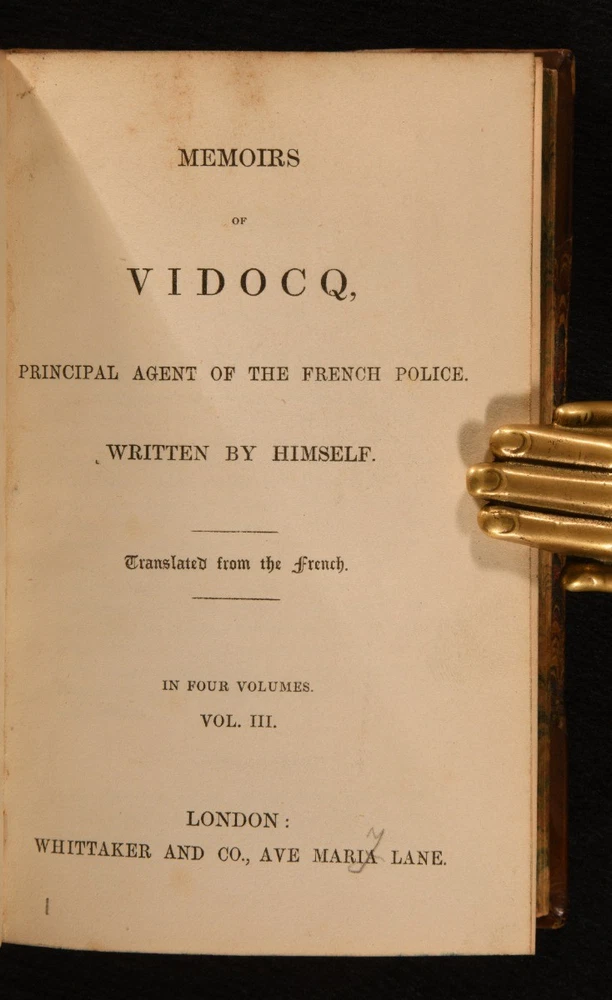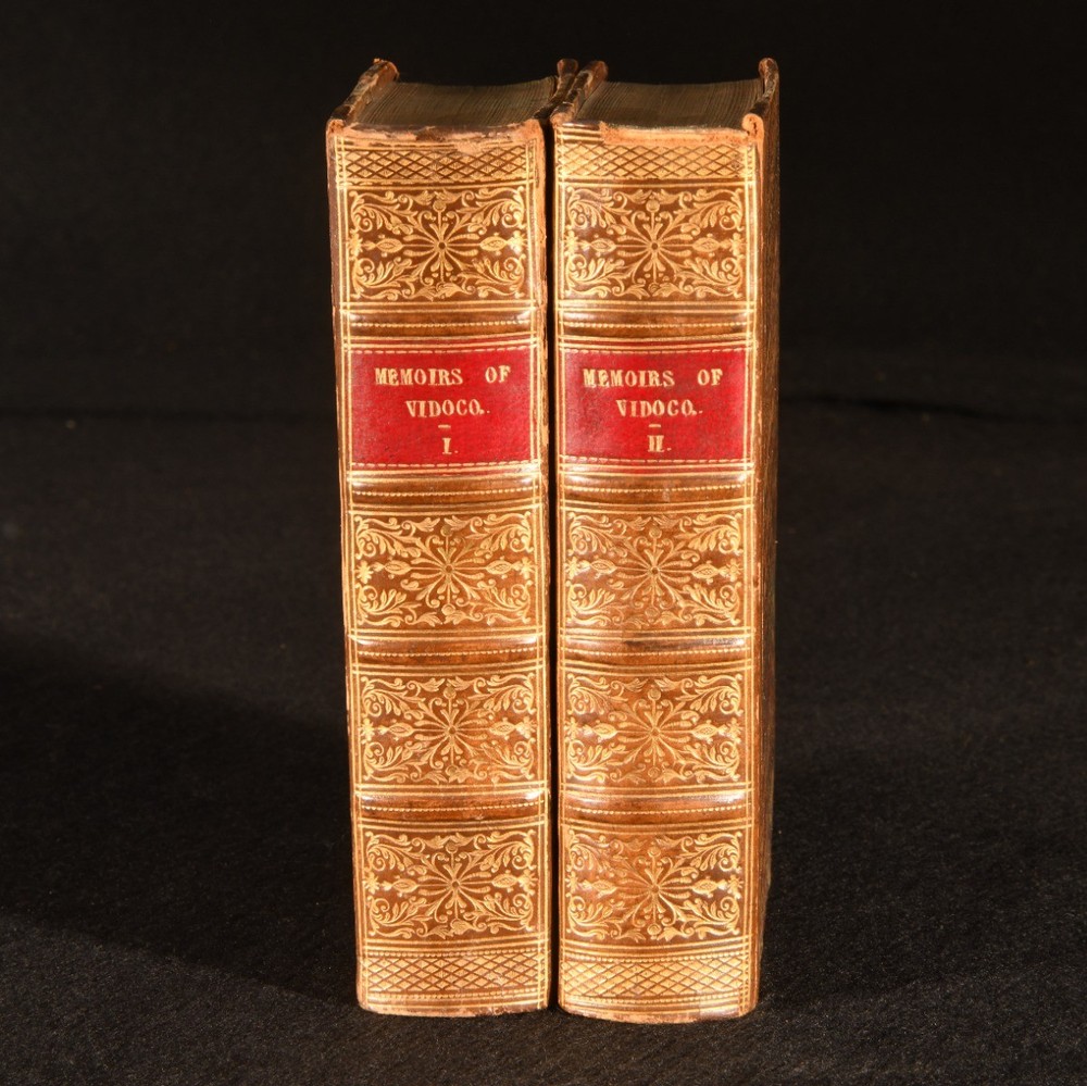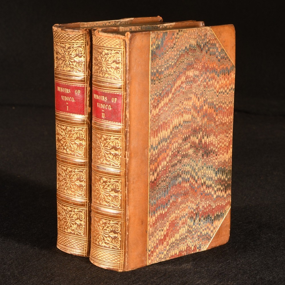 Click here to see our other books! Memoirs of Vidocq, Principal Agent of the French Police. [Eugene Francois Vidocq] c1840 Whittaker & Co. : London 6" by 3.5" xxii, [2], 237, ix, [3], 266; xii, 251, xii, 275pp. SUMMARY An early English translation of the memoirs of Eugène-François Vidocq, a French criminal turned criminalist, complete in four volume bound over two. Leather Binding,Scarce Overall Condition: Very Good This book weighs 1 KG when packed UK Postage: £ 3.99 US Postage: £ 22.99 EU Postage : £ 16.99 European Postage: £ 17.99 Asia Postage: £ 22.99 Worldwide Postage: £ 28.99 DESCRIPTION An early English translation. Complete in four volumes bound over two. Bound in half calf with marbled paper covered boards. Originally written in French. First published in English in 1828-9. The memoirs of French criminal turned detective, Eugène-François Vidocq, who details his extraordinary journey as he swapped a life of crime to one of justice and policing. His memoirs are filled with tales of how he outsmarted crooks through his undercover work, on one occasion even faking his own death. His approaches to criminology were innovative and unique at the time. Vidocq is considered to be the first private detective and is known for founding France's first criminal investigative agency, the Surete Nationale. His fascinating life story is said to be the inspiration behind a several prominent detective authors, including Edgar Allan Poe, Victor Hugo and Honore de Balzac. Illustrated with a frontispiece to volume I. CONDITION Bound in half calf with marbled paper covered boards. Endpapers renewed and blanks retained. Externally, very good, with rubbing to joints and extremities. Minor loss to backstrip head. Front hinge to I is a little strained, but holding firm. Internally, firmly bound. Pages are bright and clean, with just the odd light mark. Overall Condition: Very Good GLOSSARY OF TERMS Overall Condition (Dustwrapper condition rating is shown after that for the book itself, where a dustwrapper is present) Fine - Very well preserved copy showing very little wear Very Good Indeed - Only one or two minor faults, really a very attractive copy Very Good - Quite a wide term meaning no major faults but probably several smaller ones often expected given the age of the book, but still a respectable copy Good - Meaning not very good. Some more serious faults as will be described in the condition report under 'condition' Good Only - Meaning one or more faults that could really do with repair Fair - As with good only above but with other faults leaving a compromised copy even after repair Poor - Really bad and possibly seriously incomplete. We only sell books in this condition where their rarity or value makes them attractive none the less. Major defects will be described. GUARANTEE We offer a full money back guarantee on our descriptions. Please ask for details and conditions. We prefer PAYPAL. If you pay via PAYPAL we will post the item off the same or the next working day with the postage you have selected. Please note we cannot accept USD cheques