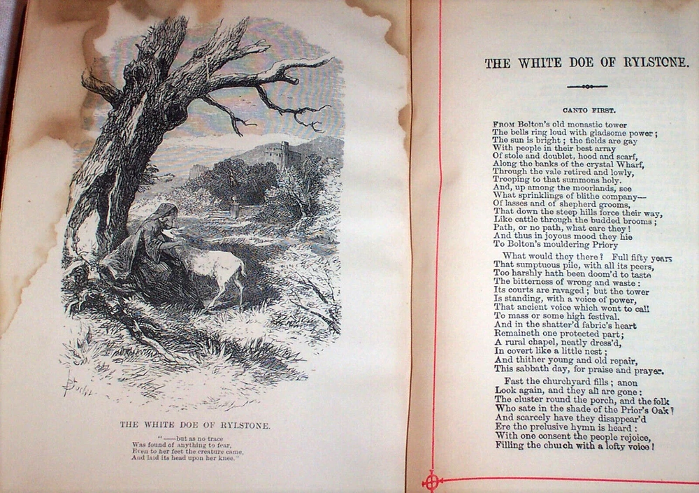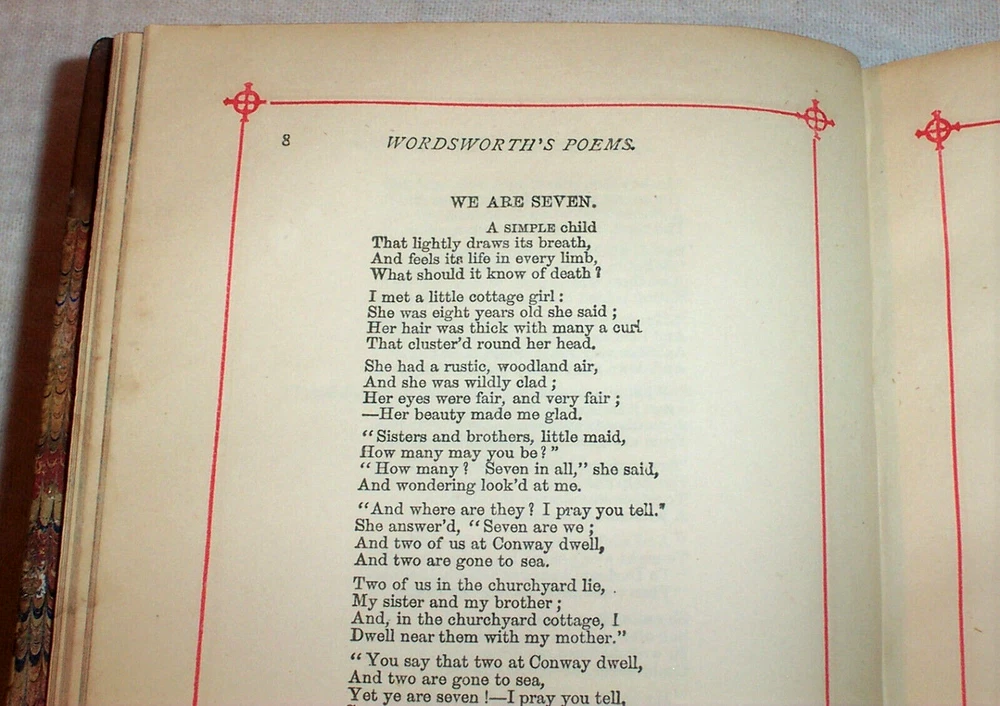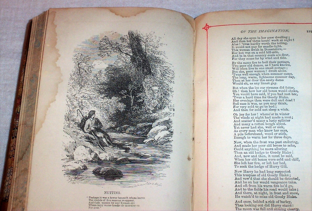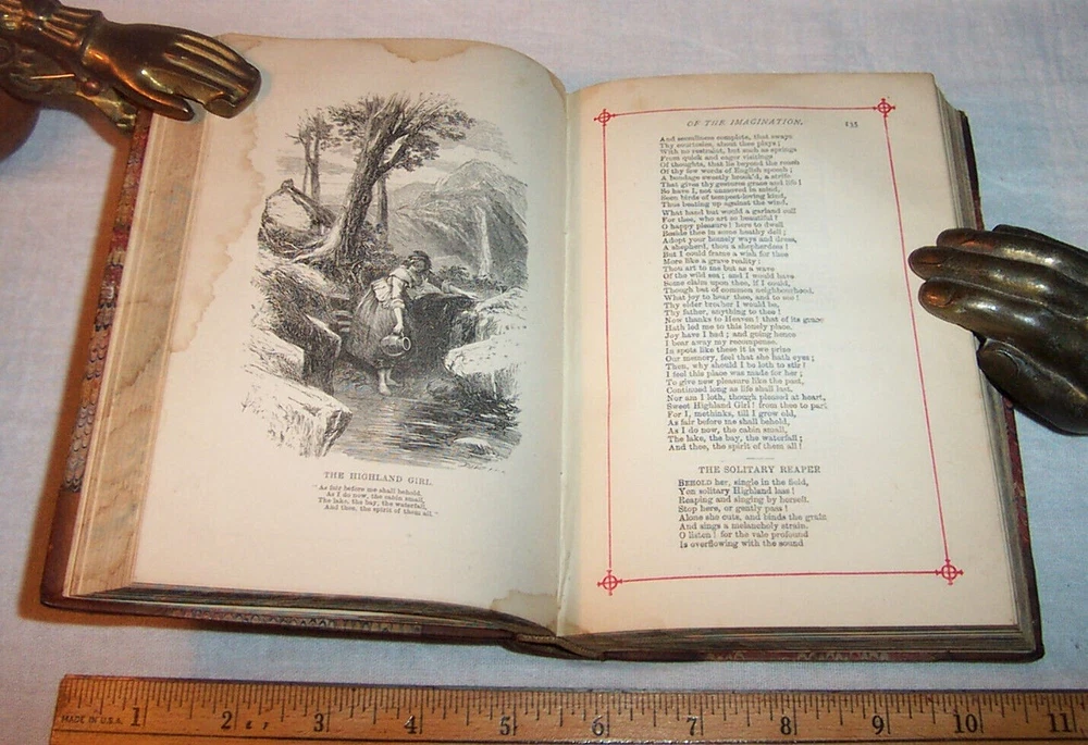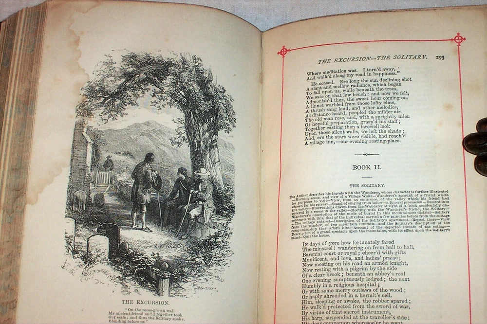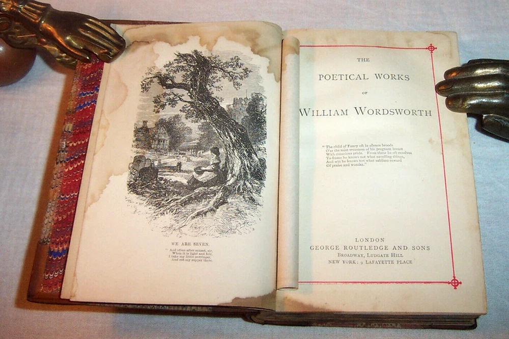 The Poetical Works Of William Wordsworth Published By George Routledge And Sons London ( England ) circa 1890 The title-page is undated, however this is a late 1800s printing. Antique hardcover. Half leather binding . Calf spine & corners, marbled boards. Raised spine bands. All page edges marbled. Marbled endpapers. Red-ruled page margins. 5" x 7.25" (23) + 496 pages. About 130 years old. Poems by William Wordsworth (1770 – 1850), a major English Romantic poet who, with Samuel Taylor Coleridge, helped to launch the Romantic Age in English literature with the 1798 joint publication Lyrical Ballads. Wordsworth was Britain's Poet Laureate from 1843 until his death in 1850. Hundreds of poems. Includes a Life of Wordsworth. --------- Condition . Binding wear, rubbing of the leather. The binding has old waterstaining. The marbled paper over the rear cover is rippled. ( see the photos ) The hinges are tight. Name in old ink on the front endpaper : " Phoebe E. Mills " No other writing. No markings. Old waterstaining on the illustration plates and the title-page. The staining is barely visible on the other pages. Slight rippling of the text pages. The pages are otherwise good. ---------- The Contents includes: Life of William Wordsworth Poems of Childhood To A Child During A Boisterous Winter Evening The Shepherd Boys The Blind Highland Boy ( Scotland ) The Mother's Return The Norman Boy The Westmoreland Girl Characteristics of A Child Three Years Old Anecdote For Fathers Etc. Written in Youth An Evening Walk While Sailing a Boat Guilt and Sorrow or Incidents on Salisbury Plain Etc. Poems Founded on the Affections The Brothers Lament of Mary Queen Of Scots To A Butterfly Complaint of A Forsaken Indian Woman The Childless Father The Sailor's Mother The Last of The Flock The Widow on Windemere Side Maternal Grief The Idiot Boy The Armenian Lady's Love Etc. Poems of the Fancy and Imagination To The Daisy The Oak And The Broom The Danish Boy Song For The Wandering Jew The Redbreast and the Butterfly The Kitten And The Falling Leaves To My Infant Daughter Love Lies Bleeding The Wagoner To The Cuckoo Yew Trees View From The Top of Black Comb - Cumberland Nutting " She Was A Phantom of Delight " The Horn of Egremont Castle "I Wandered Lonely As A Cloud" Stepping Westward Glen Almain Gipsies Beggars Star Gazers The Pass of Kirkstone Resolution and Independence Song at the Feast of Brougham Castle Lines Composed Near Tintern Abbey The Haunted Tree A Jewish Family Peter Bell - A Tale Etc. Poems proceeding from Sentiment and Reflection Character of the Happy Warrior Rob Roy's Grave ( Rob Roy of Scotland ) Lines lift upon a Seat in a Yew Tree A Poet's Epitaph To The Sons of Burns - After Visiting Their Father's Grave It Is The First Mild Day of March Simon Lee - The Old Huntsman Lines Written While Sailing A Boat At Evening Incident of A Favourite Dog The Force of Prayer Fidelity Ode To Duty Etc. " The White Doe of Rhylstone " ( about 40 pages ) Miscellaneous Sonnets " Upon Sight of A Beautiful Picture " " The Fairest, Brightest Hues of Ether Fade " " Hail Twilight, Sovereign of One Peaceful Hour " " Even As A Dragon 's Eye " " These Words Were Uttered In A Pensive Mood " " Dark And More Dark The Shades of Evening Fell " To Sleep To The Supreme Being " Earth Has Not Anything To Show More Fair " " Composed upon Westminster Bridge , September 3, 1802 " " Surprised By Joy " " What Need of Clamorous Bells or Ribbons Gay " " From The Chambers of Dejection Freed " On approaching Home after a Tour of Scotland Composed among the Ruins of a Castle in North Wales Captivity - Mary Queen of Scots With Ships the Sea was sprinkled Composed on the Eve of the Marriage of a Friend in the Vale of Grasmere , 1812 At Applethwaite , near Keswick The Wild Ducks Nest Even as a Dragon 's Eye Etc., Etc. Sonnets Dedicated to Independence and Liberty " Fair Star of Evening, Splendour of The West " " O Friend! I Know Not Which Way I Must Look " " Milton Thou Shouldest Be Living At This Hour " " Great Men Have Been Amoung Us " " Is It A Reed That's Shaken By The Wind " " There Is A Bondage That's Worse To Bear " " Six Thousand Veterans Practiced In War's Game " " Shout For A Mighty Victory's Won " " O'er The Wide Earth, On Mountain And On Plain " " Is There A Power That Can Sustain And Cheer? " " In Due Observance of An Ancient Rite " " The Power of Armies Is A Visible Thing " The Oak of Guernica On A Celebrated Event In Ancient History A Prophecy , 1807 The Oak of Guernica Indignation of a high-minded Spaniard Spanish Guerillas Etc., Etc. Thanksgiving Odes Ode For The Morning of the Day Appointed For A General Thanksgiving When The Soft Hand of Sleep Had Closed The Latch Miscellaneous Pieces Ode " Who Rises On The Banks of the River Seine " Elegiac Verses " O! For The Kindling Touch of That Pure Flame " To Joanna There Is An Eminence of These Our Hills Etc. Inscriptions Written With A Slate Pencil Upon Stone In A Quarry In the Islands at Rydale Written Upon Stone in Black Comb Cumberland In The Garden At Coleorton Written On The Wall of the House On the Island of Grasmere ( Cumbria , England ) Inscriptions in a Hermit's Cell Etc. Poems referring to Old Age The Old Cumberland Beggar The Farmer of Tilsbury Vale The Two Thieves Animal Tranquility Etc. Epitaphs ( several ) " The Excursion " ( a long poem , 150 pages ) ---------------- 130+ years old. Carefully packed for shipment to the buyer.