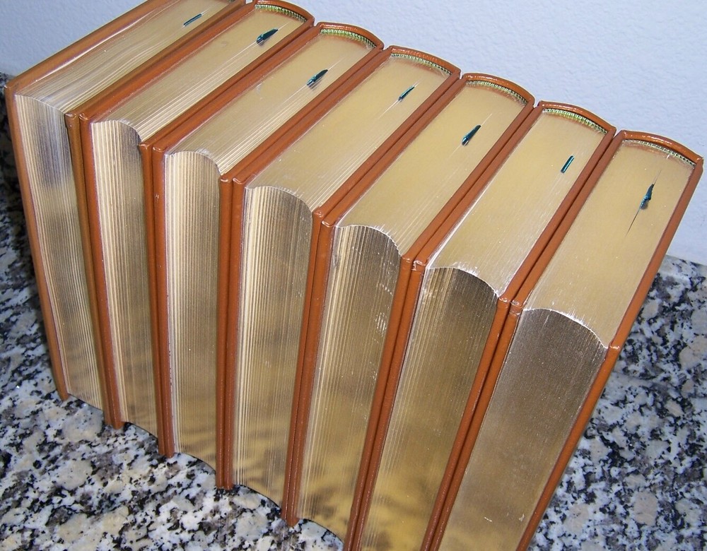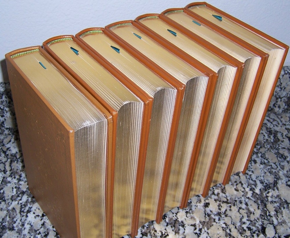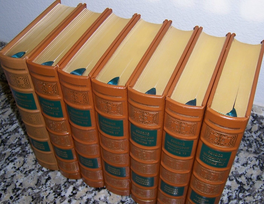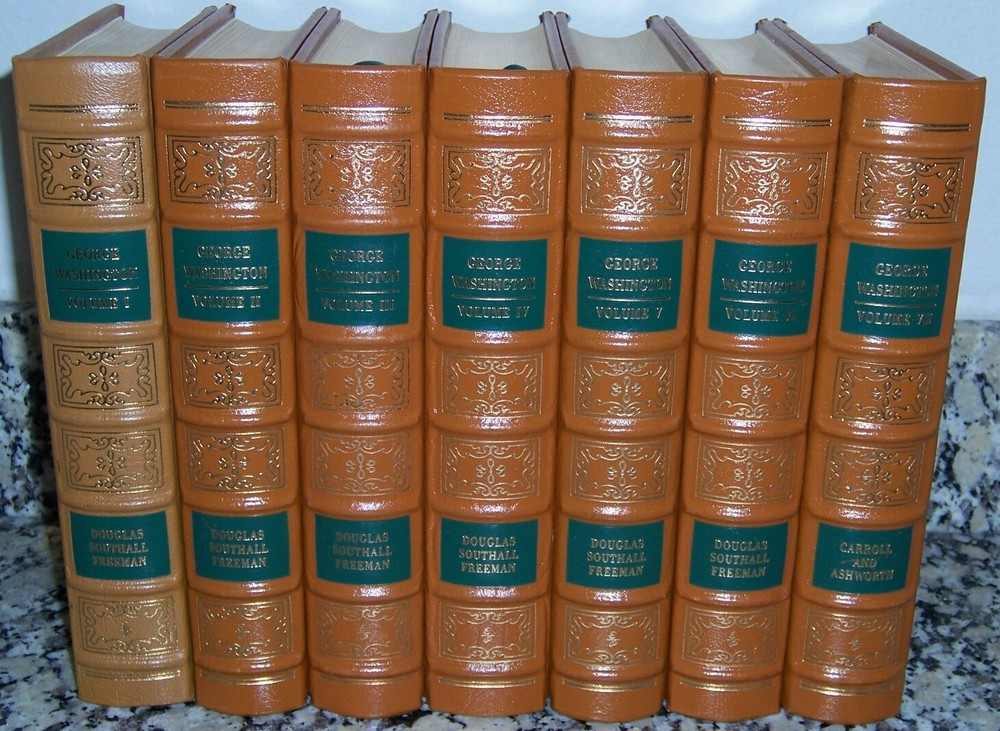 Books from Easton Press Bound in premium leathers, distinctive cover design, hubbed spine accented in 22-karat gold Endsheets of rich moire fabric, permanent satin ribbon page marker Thread sewn pages for strength and durability, gilded page edges for beauty and protection Handsome readable typefaces, beautiful illustrations, archival-quality acid-neutral paper TITLE Easton Press GEORGE WASHINGTON A Biography in 7 volumes AUTHOR Volumes I-VI by Douglas Southall Freeman and Volume VII, written by John Alexander Carroll and Mary Wells Ashworth after Dr. Freeman's Death in 1953 MORE DETAILS uniform binding inorange, green title/author background boxes on spine, with numerous illustrations, maps and photos: Volume I: Young Washington Volume II: Young Washington (continued) Volume III: Planter and Patriot Volume IV: Leader of the Revolution Volume V: Victory with the Help of France Volume VI: Patriot and President Volume VII: First in Peace DESCRIPTION Like new condition, but with some light marks/ scuff on gilt edges as shown in the photos, also Vol. I one shade lighter than others, unread, clean inside, tight hardcover binding SHIPPING Books will be packed safely, and shipped via USPS Media Mail with tracking number.